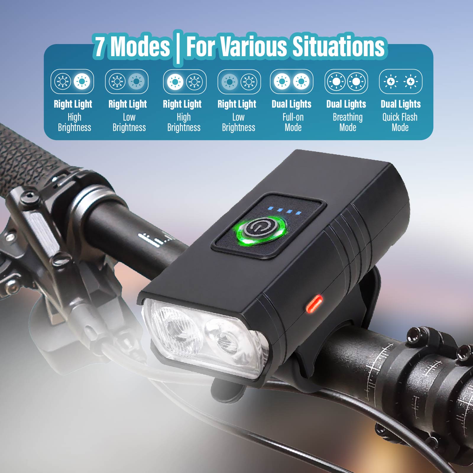 LG07-022Need maximum brightness? Switch to high beam. Riding in the city? Low beam or slow flash keeps you visible without blinding others. In an emergency? Activate SOS mode to signal for help. With just a single button, you can easily adapt to any situation, day or night. Ride smarter, ride safer!