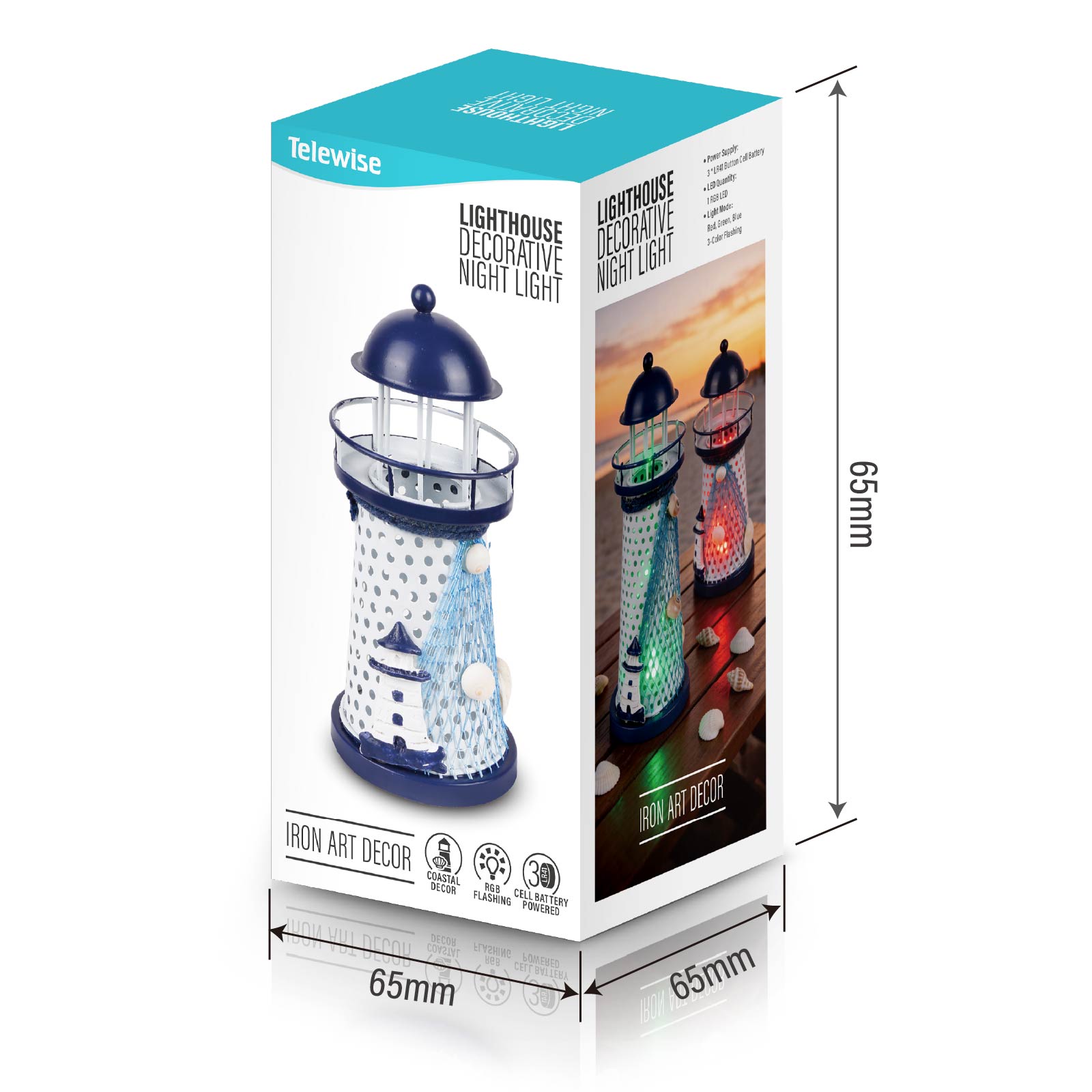 LG03-436Bring the magic of the coastline to your space! This eye-catching iron art lighthouse, adorned with authentic fishing net and natural shells, glows with vibrant red, blue and green flashing lights. Perfect for adding a whimsical nautical vibe to your home, patio or party.