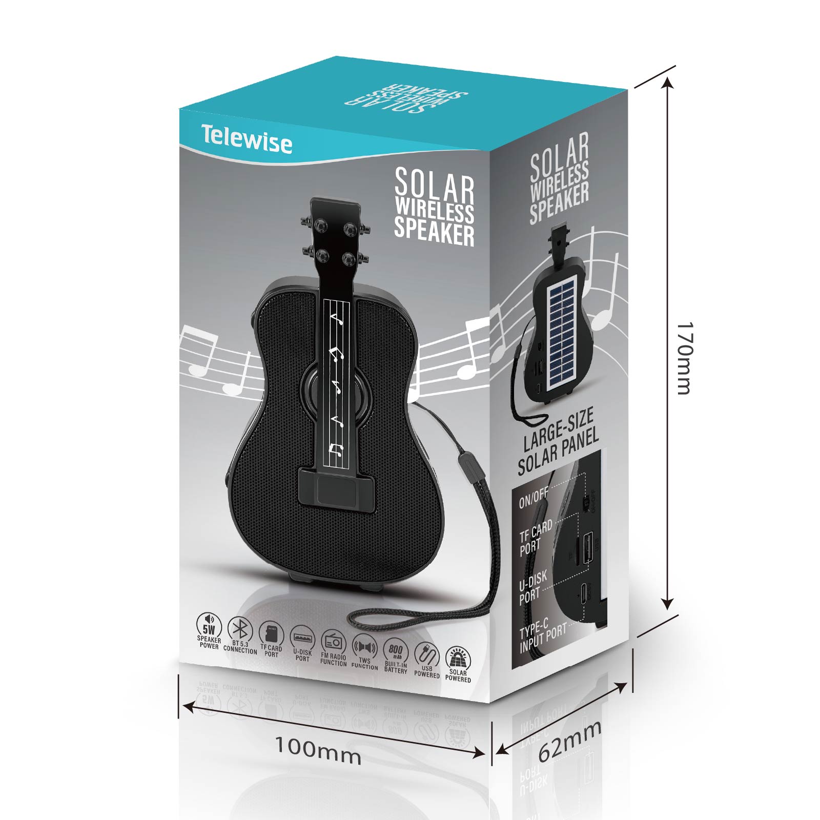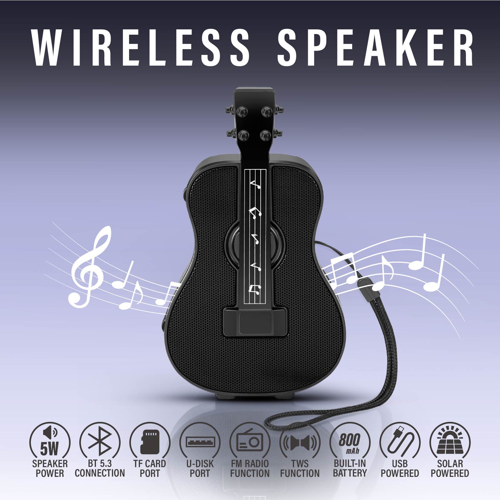BT03-414A guitar that Sings !Wireless Bluetooth speaker, sound & style in one. Function: Bluetooth Speaker, TF Card Port, U-Disk Port, FM Radio, TWS, Built-in Rechargeable Battery, USB Powered, Solar Powered.