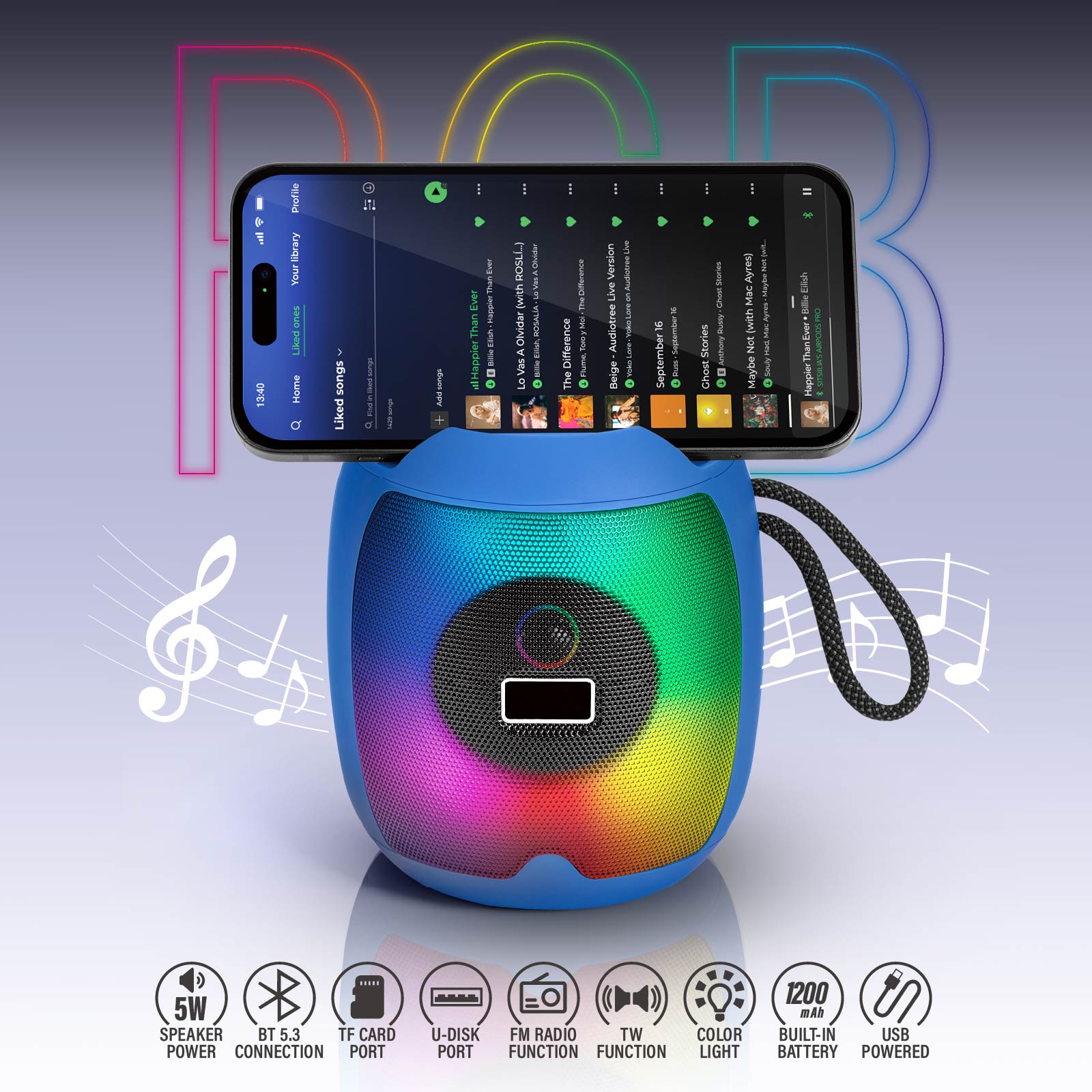 BT03-416RGB Wireless Speaker: Immersive Sound, Stunning RGB Glow, and a Practical Phone Stand for Your Daily Use!