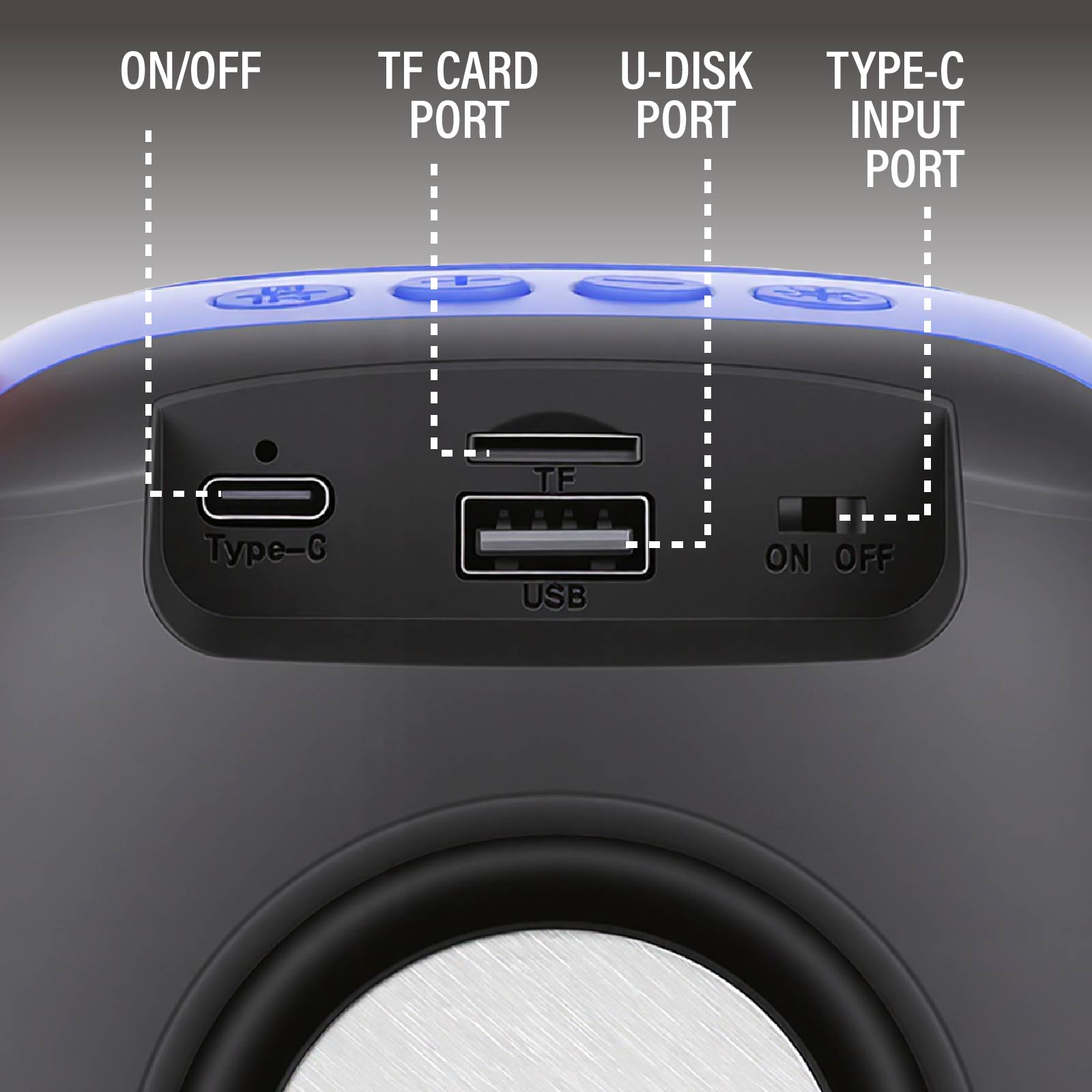 - Function : Bluetooth Speaker, TF Card Port, U-Disk Port, FM Radio, TWS, RGB Light, Built-in Rechargeable Battery, USB Powered
