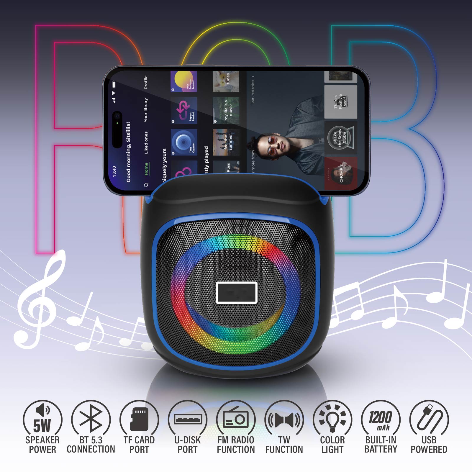 BT03-417RGB Wireless Speaker: Immersive Sound, Stunning RGB Glow, and a Practical Phone Stand for Your Daily Use!