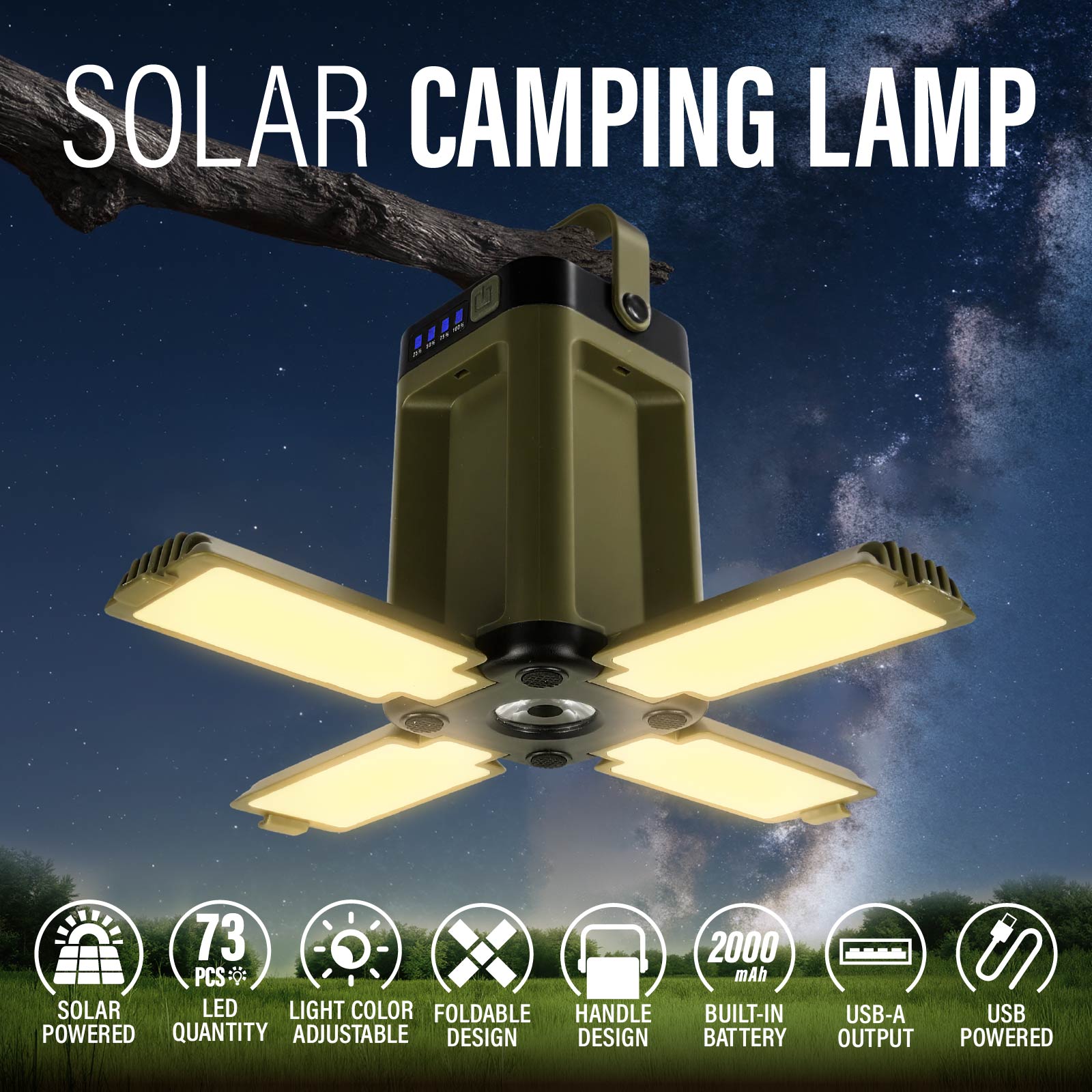 - Function : Solar Powered, Foldable Design, Camping light & Flashlight, Handle Design, Built-in Rechargeable Battery, USB Powered