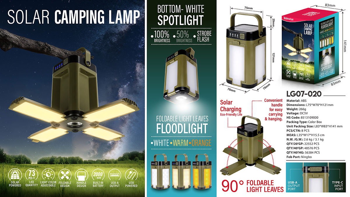 LG07-020Our Solar Camping Lamp is designed to turn every campsite, backyard, or emergency situation into a well-lit, worry-free space—all while harnessing the limitless power of the sun.