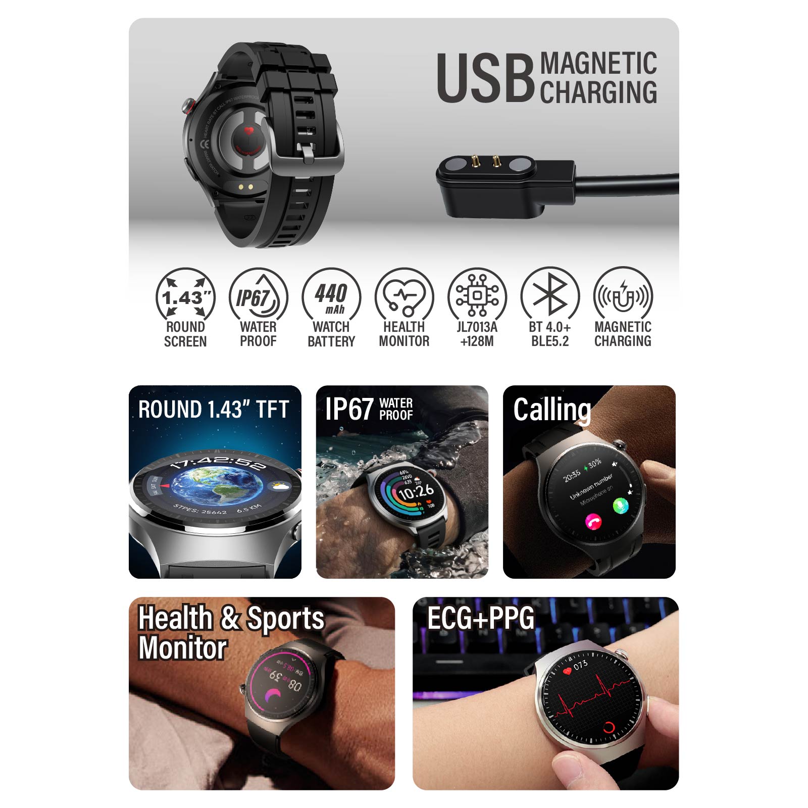 - Screen : Round 1.43” TFT (466*466 pixel)