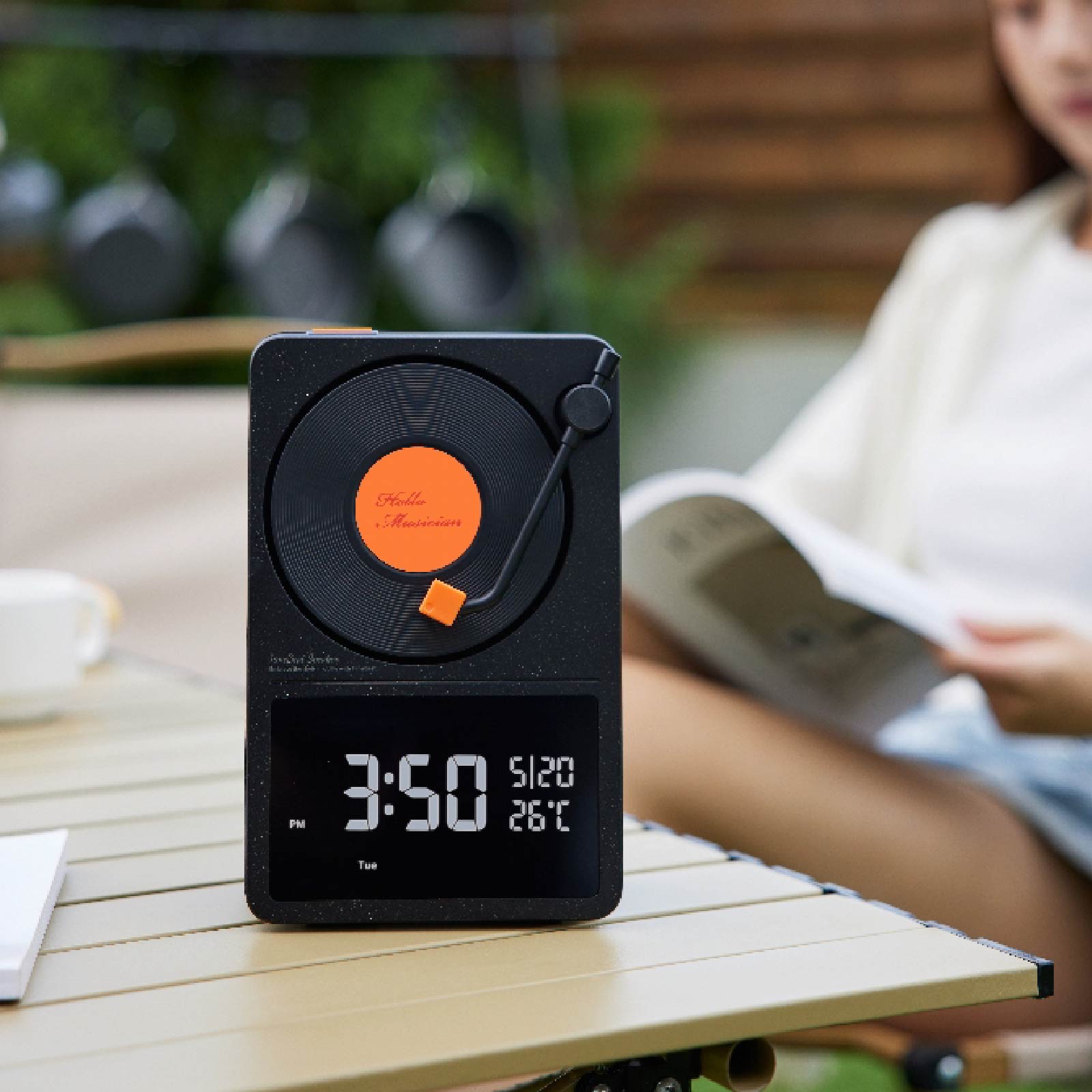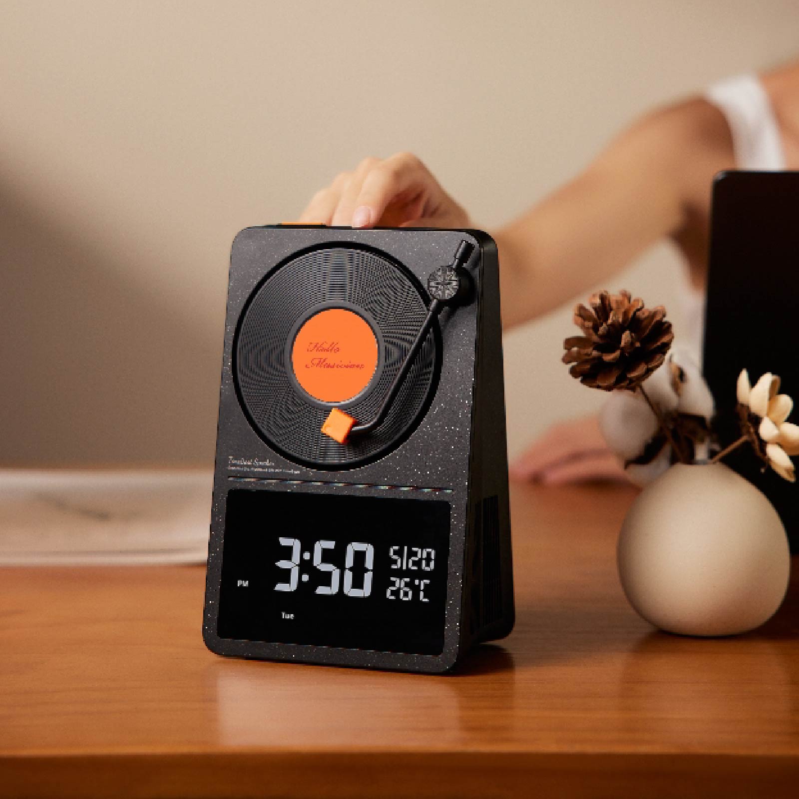 - Function : Bluetooth Speaker, Clock Display Function, 360° Rotating Vinyl Design, Built-in Rechargeable Battery, USB Powered