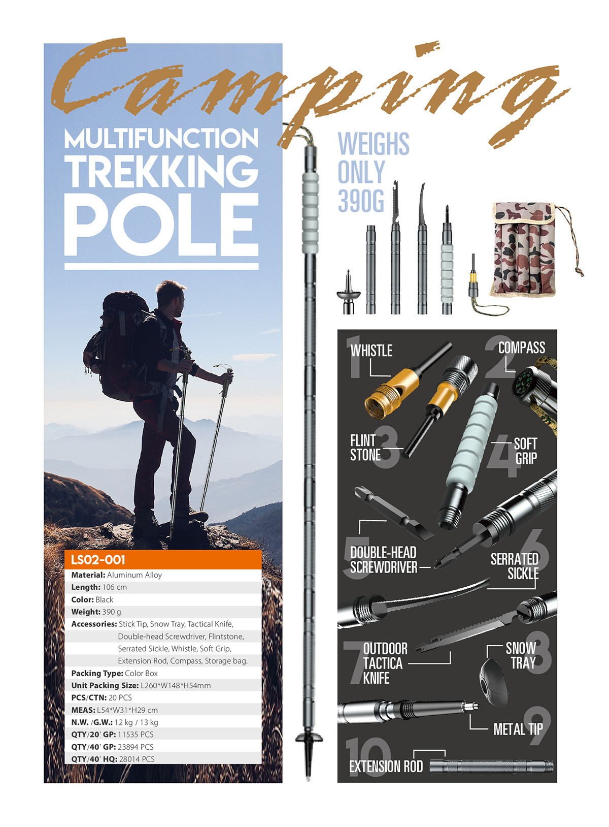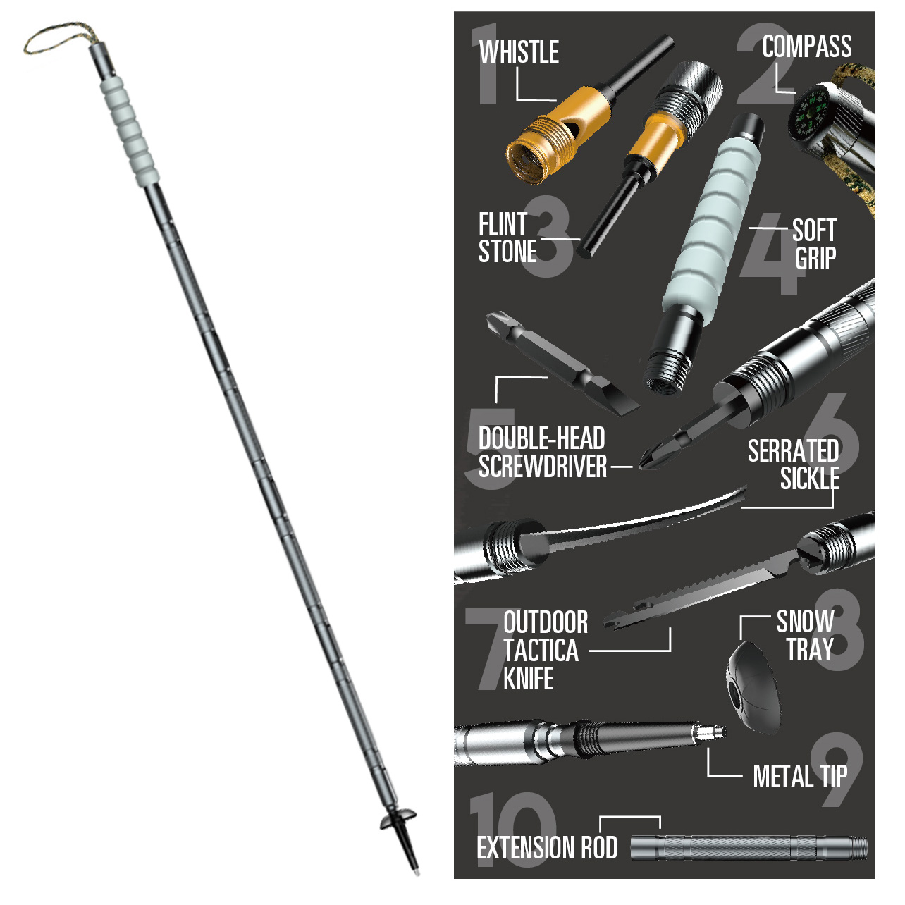 - Accessories : Stick tip integrated shock absorber, Extension Rod x 2, Tactical Knife, Sickle, Screwdriver, Flintstone, Whistle, Compass, Snow Tray.