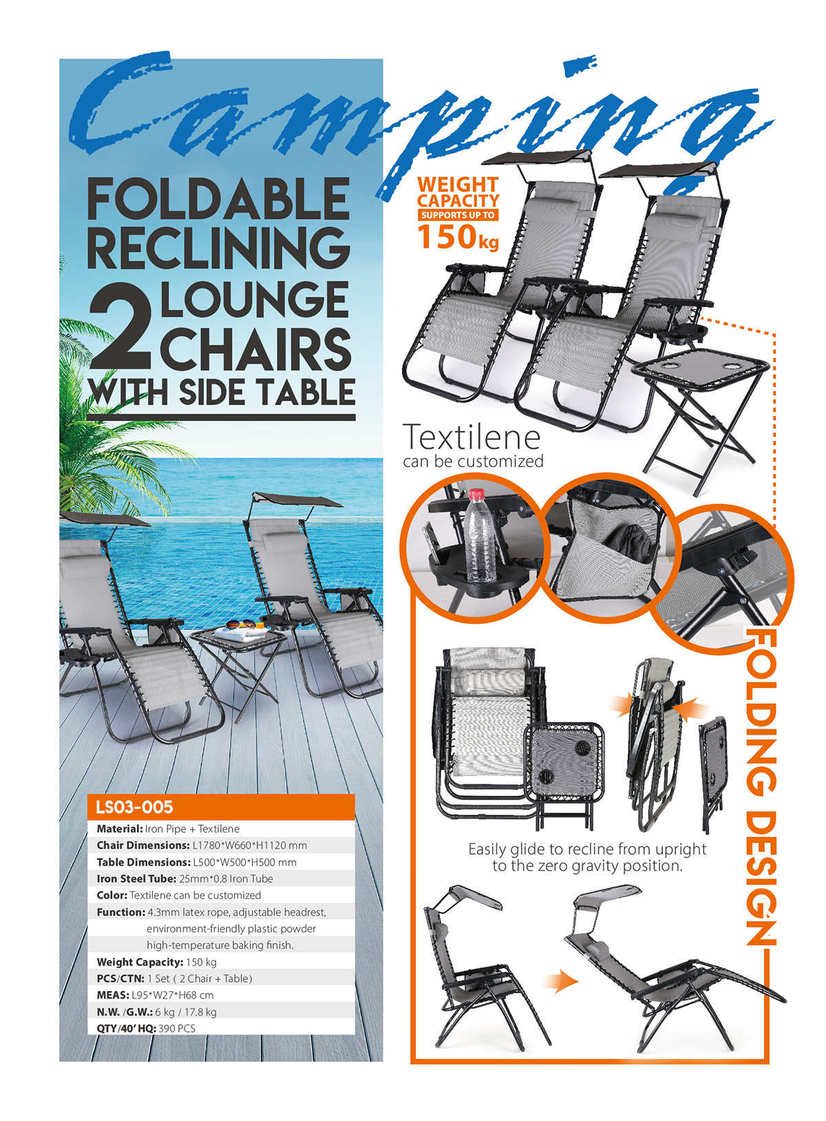 LS03-005This chair is built with quality textilene mesh, a sturdy steel frame, and a comfortable removable pillow. Designed with a lockable reclining system, this chair adjusts comfortably to your body. An effortless folding mechanism provides easy transportation and compact storage.