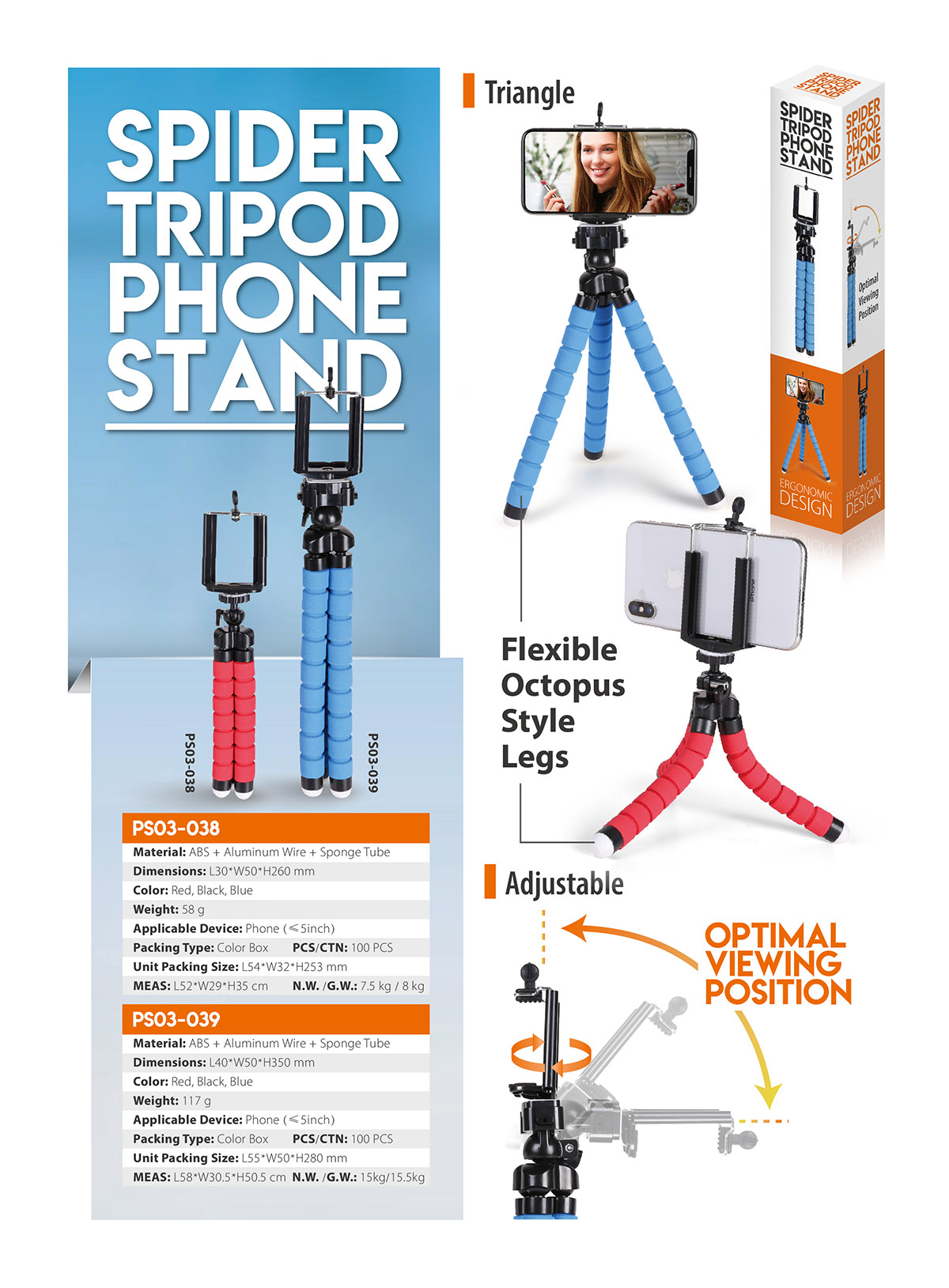 PS03-038Flexible octopus style legs & adjustable phone holder, multiple angle viewing: for optimal viewing position.