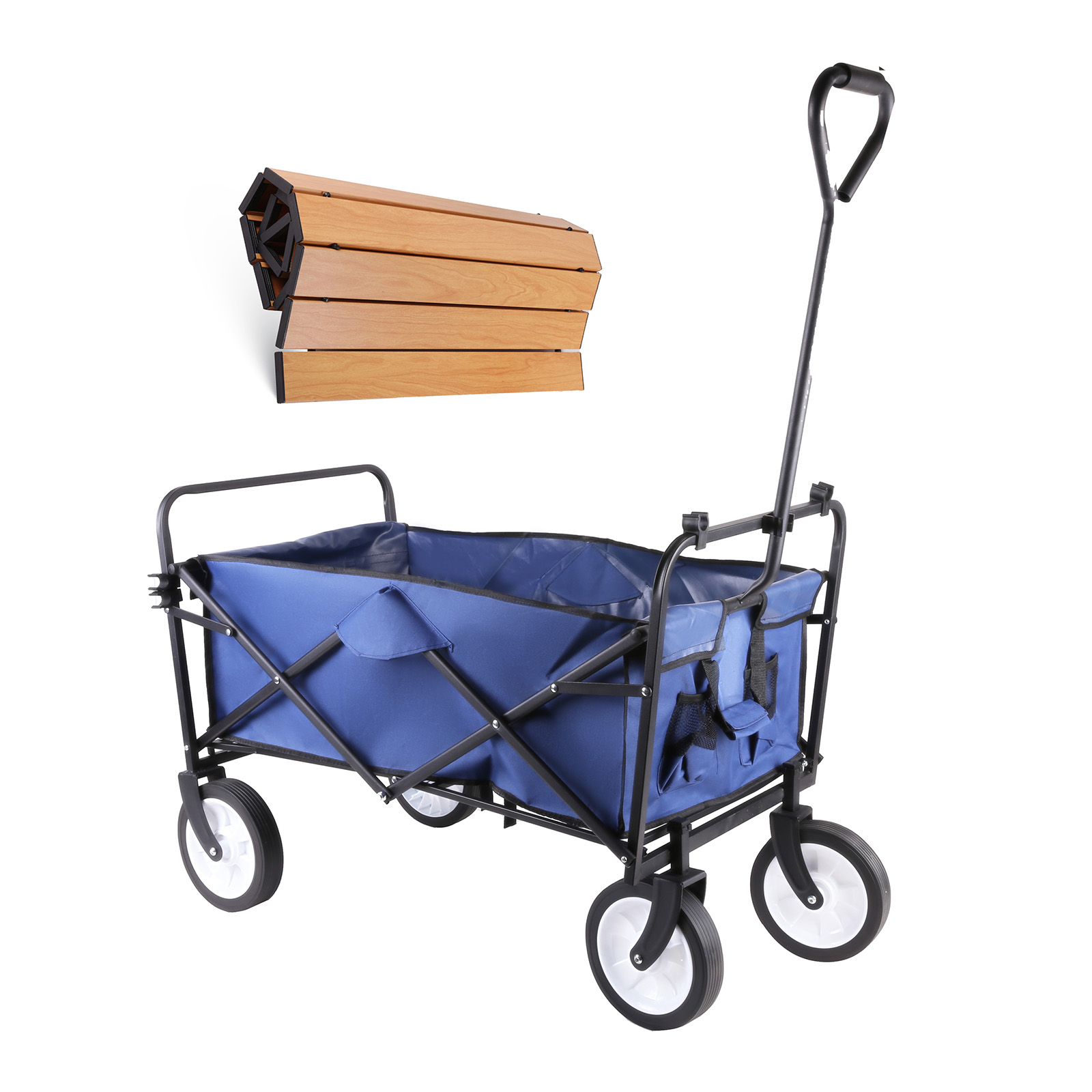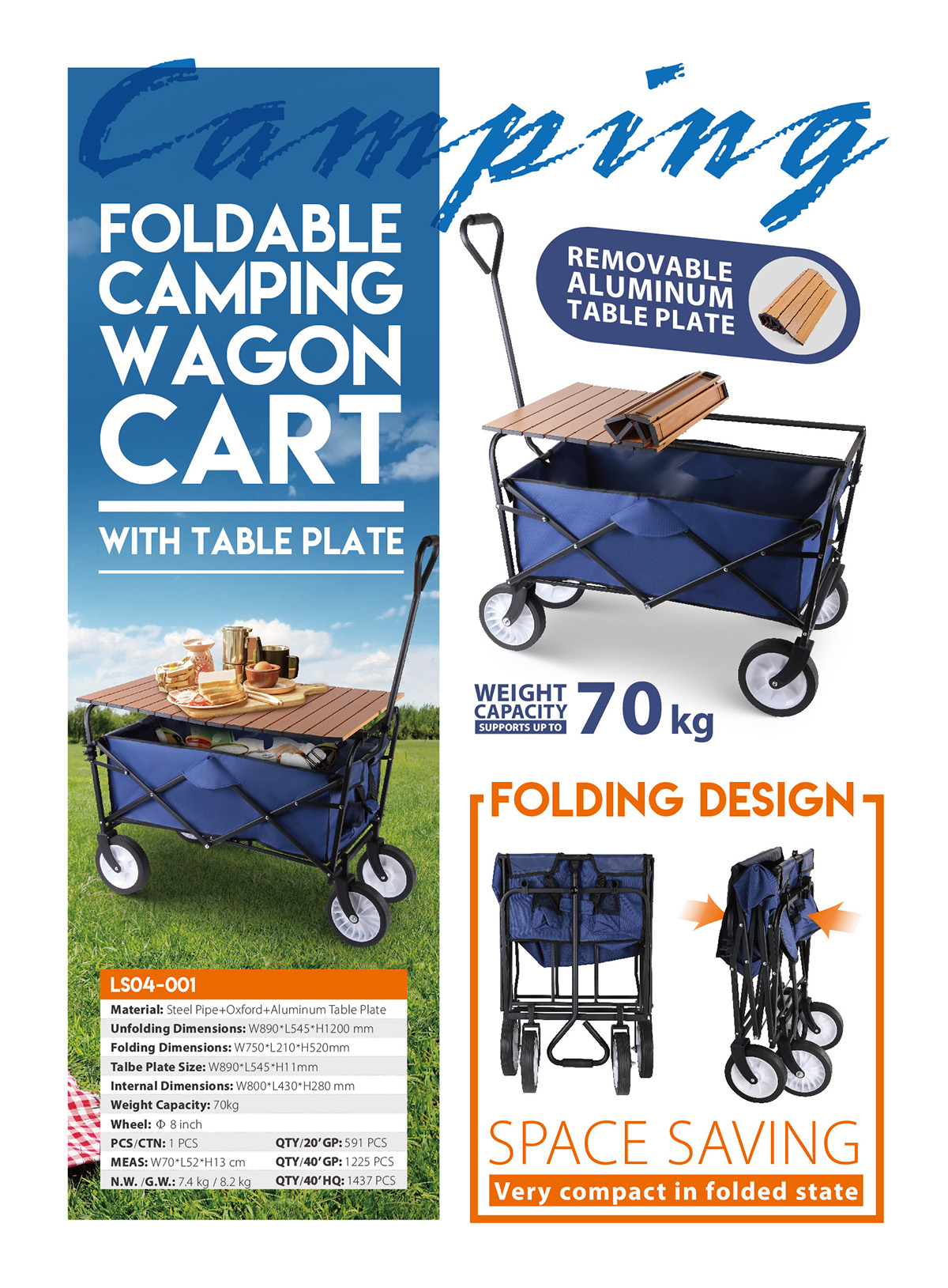 LS04-001It comes with a foldable table board, it is a good table when camping, easy to install and store. Equipped with wide and all-terrain wheels, our camping wagon ensures a smooth pull and easy transport on multiple ground surfaces. The 360-degree front wheels as well as flexible telescoping handle with rebound function allows you to navigate terrain with ease.