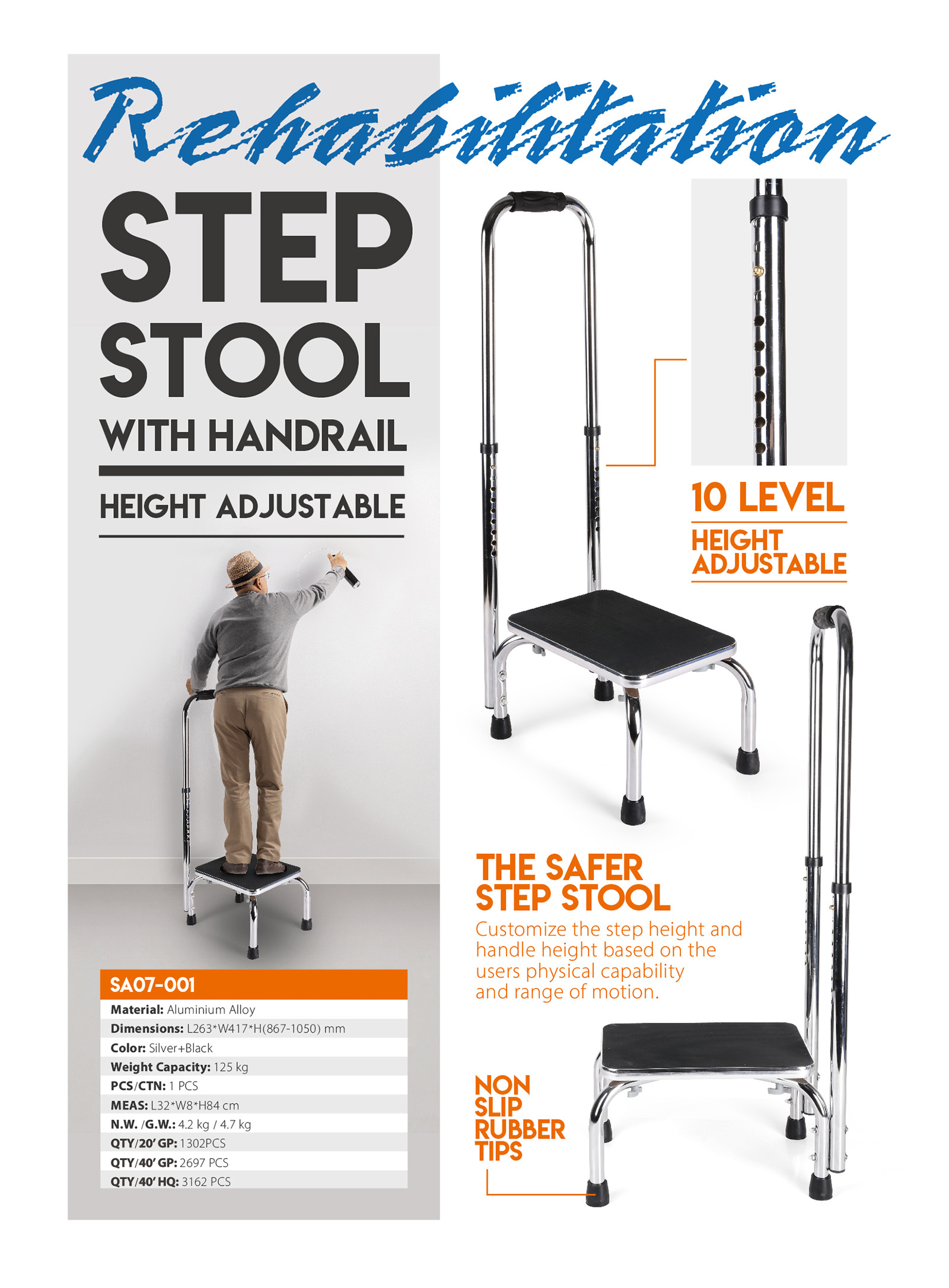 SA07-001The safer step stool- customize the step height and handle height based on the users physical capability and range of motion.