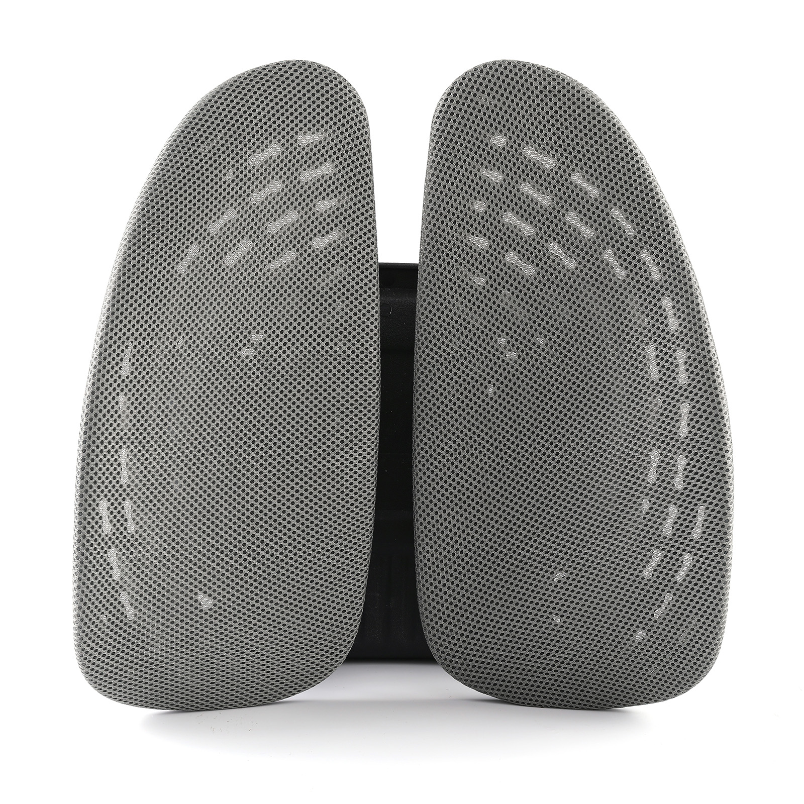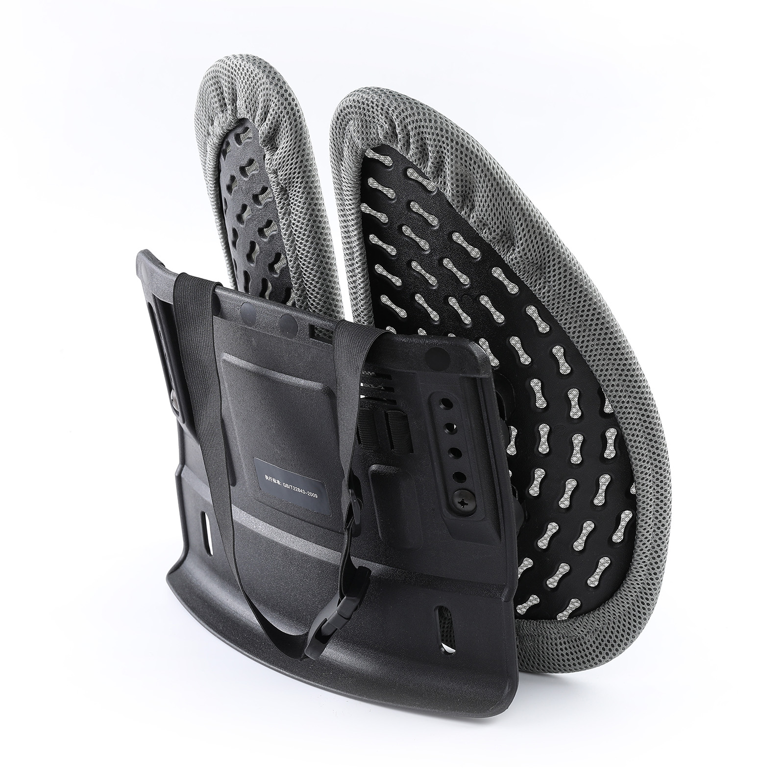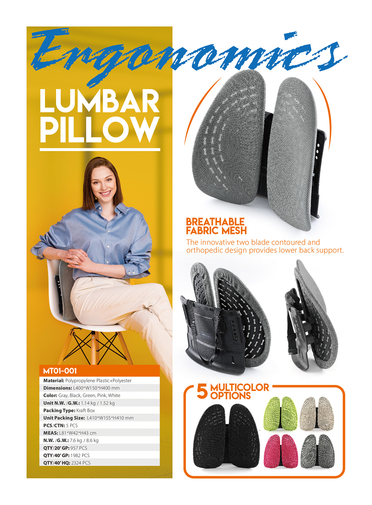 MT01-001It serves as a back posture corrector for both men and women at work, at home, or on the road, and turns any chair into an ergonomic chair. The innovative two blade contoured and orthopedic design provides lower back support.