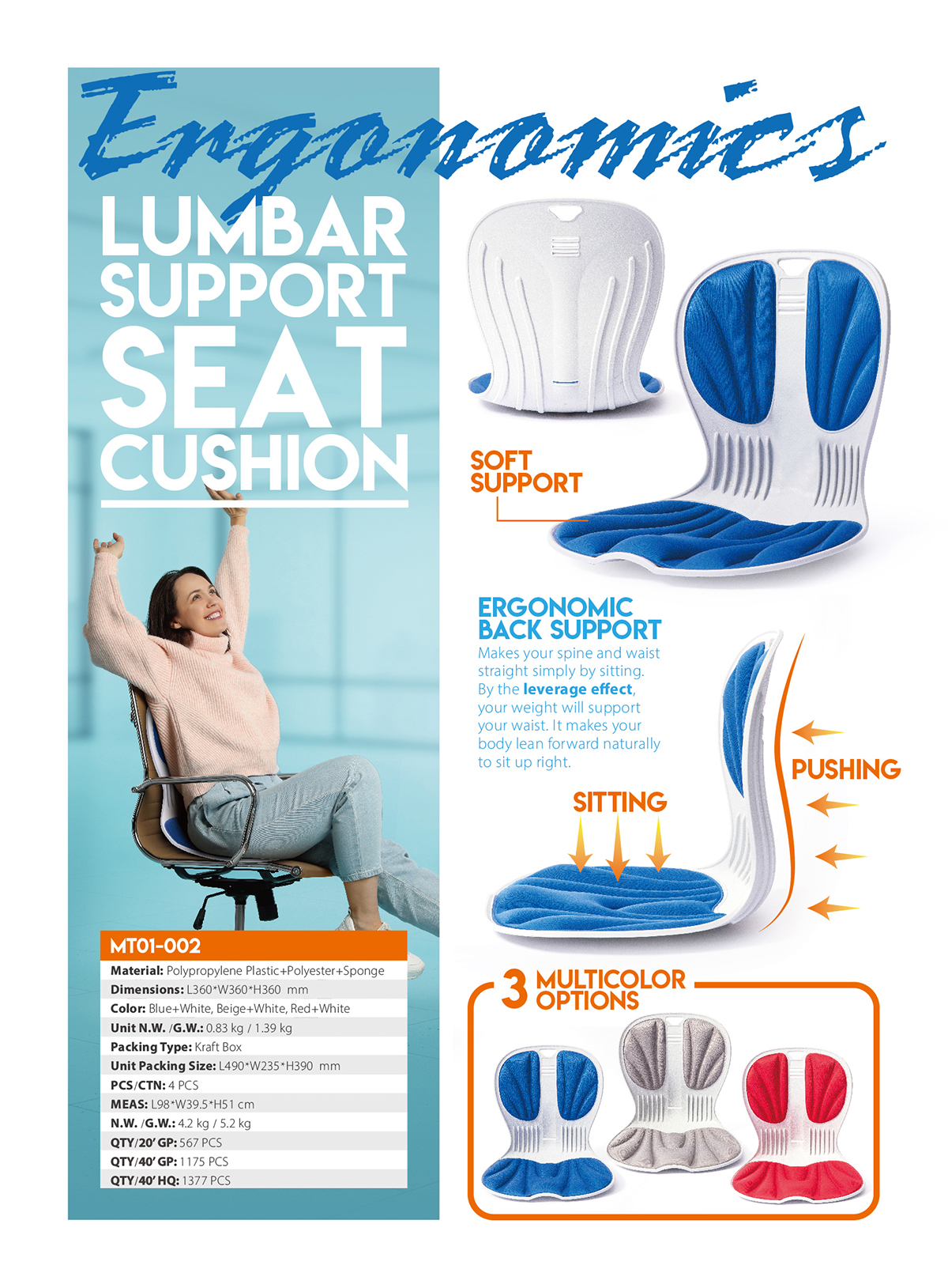 MT01-002Ergonomic Back Support. Makes your spine and waist straight simply by sitting. By the leverage effect, your weight will support your waist. It makes your body lean forward naturally to sit up right.