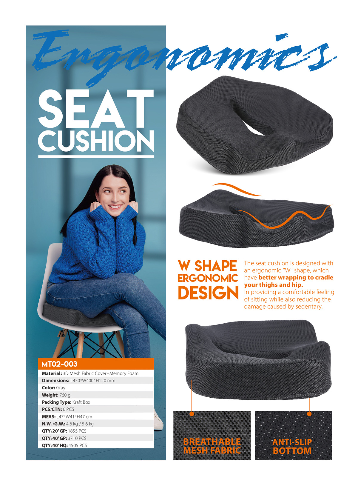 MT02-003The seat cushion is designed with an ergonomic "W" shape, which have better wrapping to cradle your thighs and hip. In providing a comfortable feeling of sitting while also reducing the damage caused by sedentary.