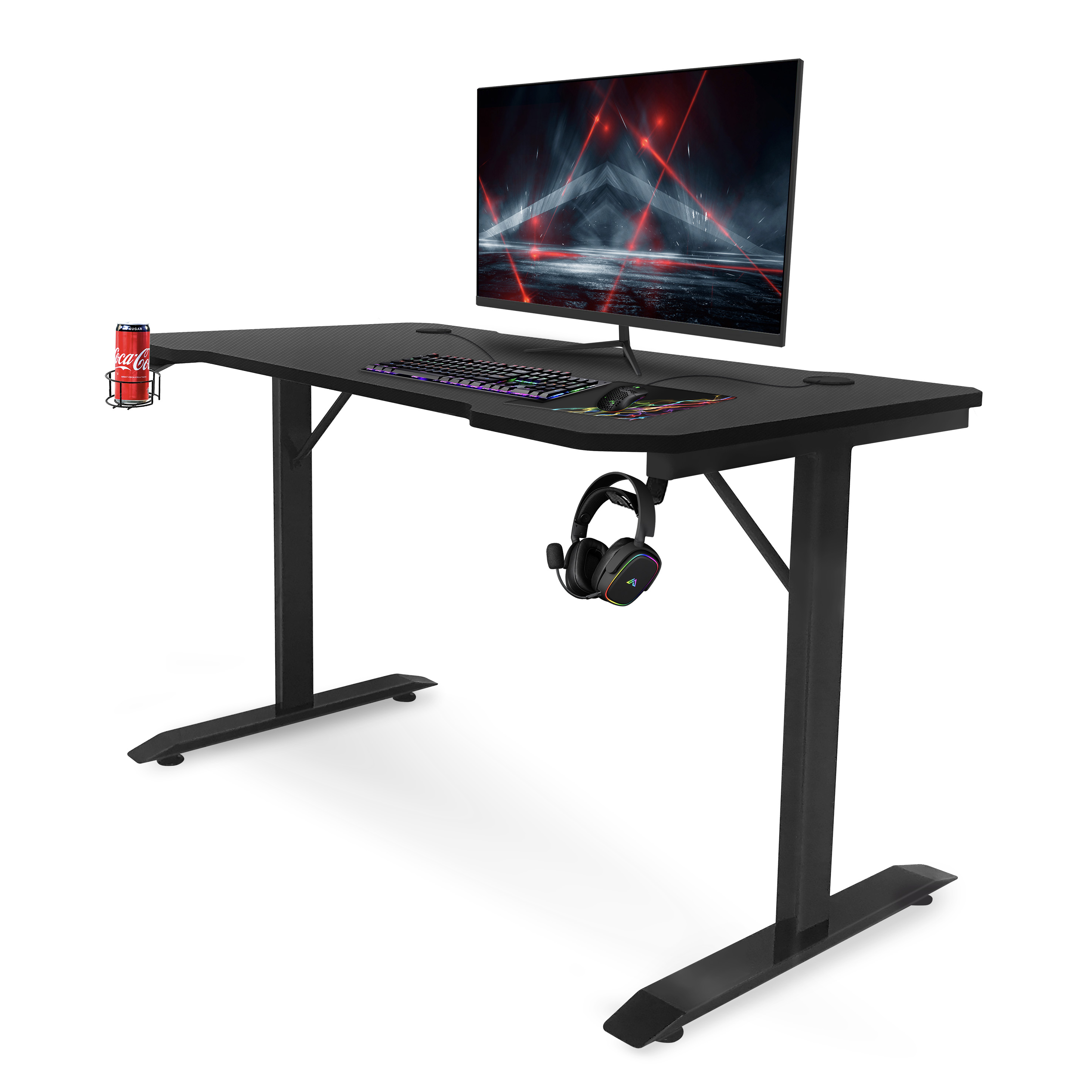 With cup holder & headphone hook, leveling feet, ergonomic edge for comfort, textured desk surface.