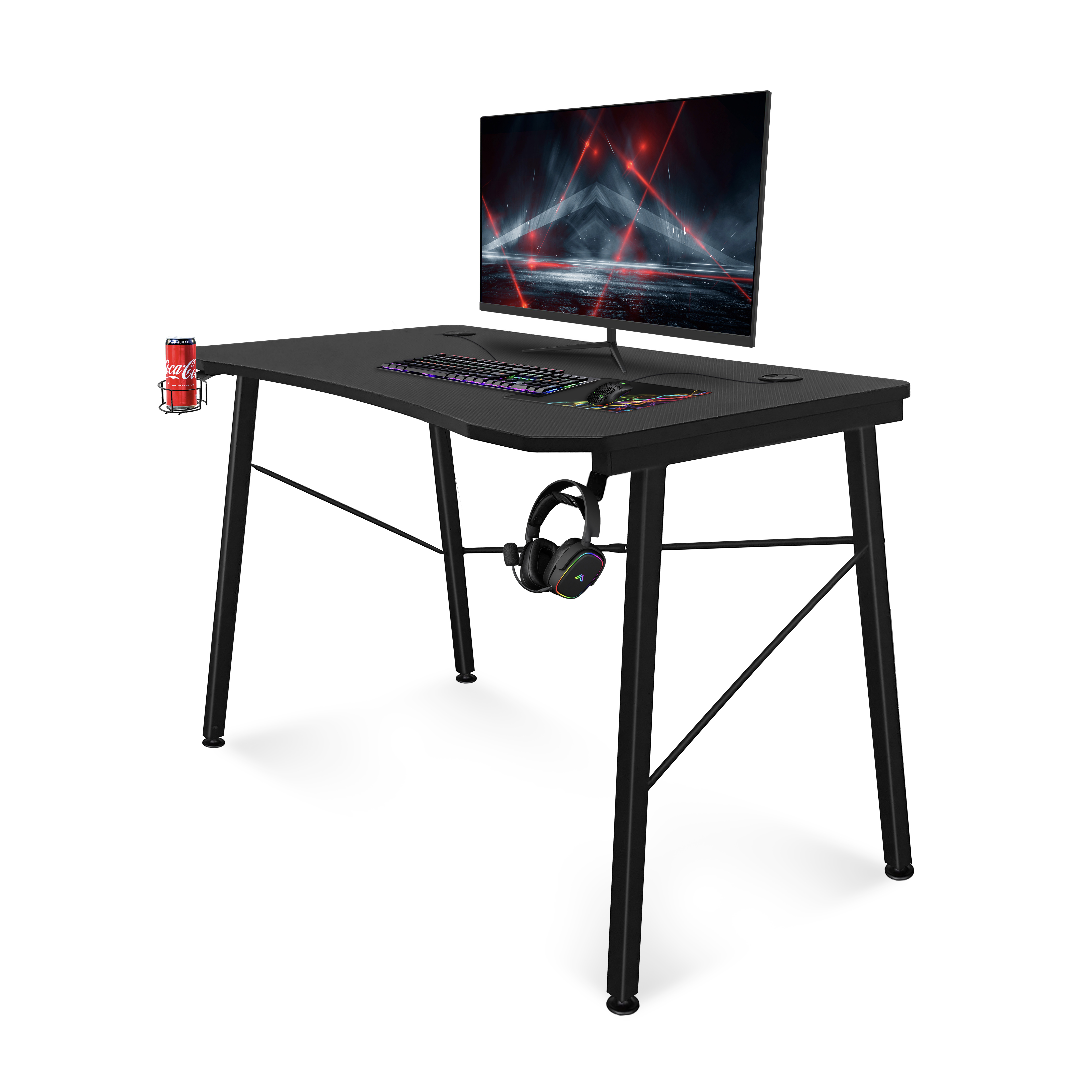 DS01-006With cup holder & headphone hook, leveling feet, ergonomic edge for comfort, textured desk surface.