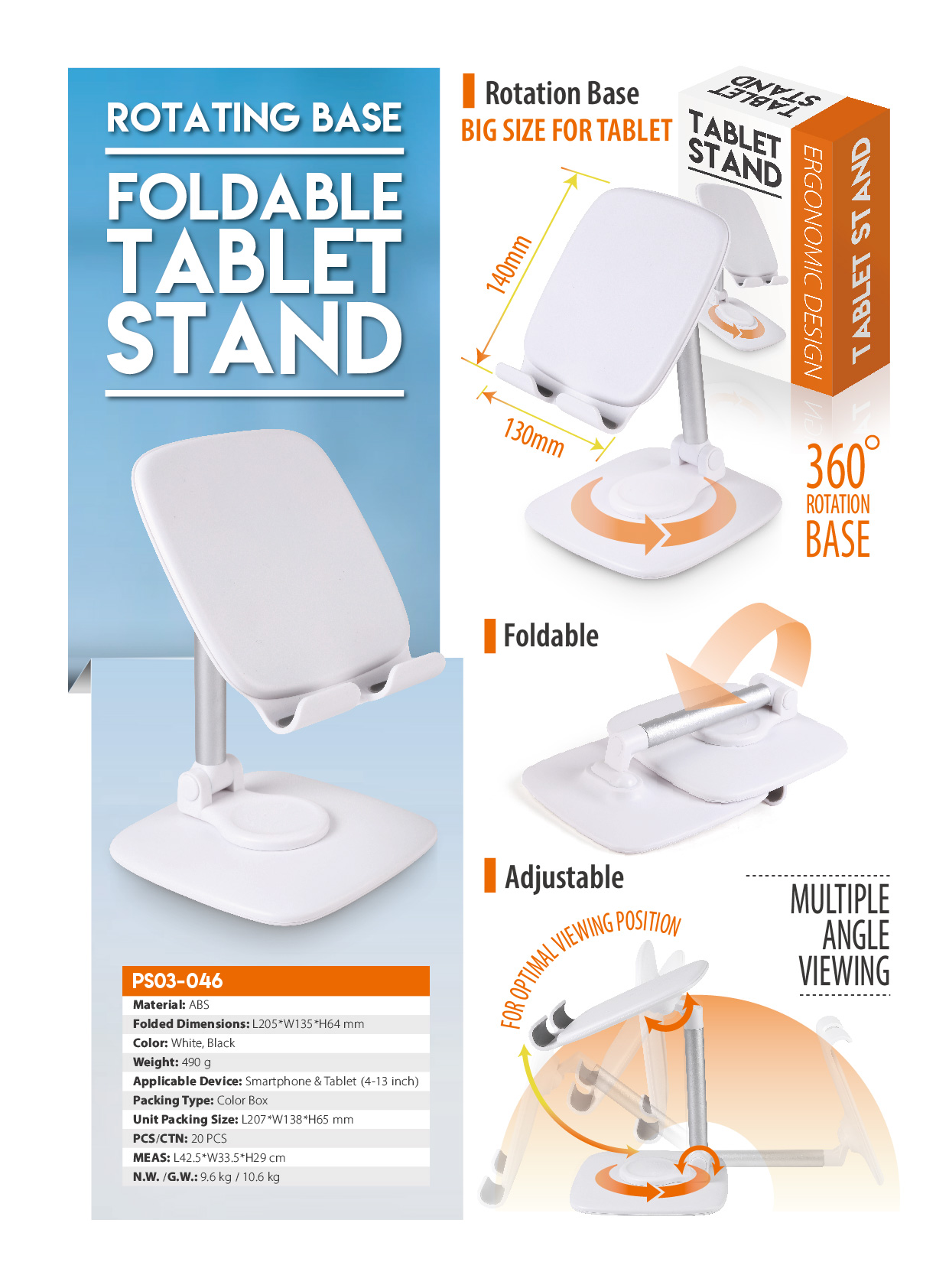 PS03-046You can make your device at optimal viewing position with angle adjustment function. Ideal for watching videos, reading, video recording, or simply browsing the web. Foldable design allows for easier carrying during travel coupled.