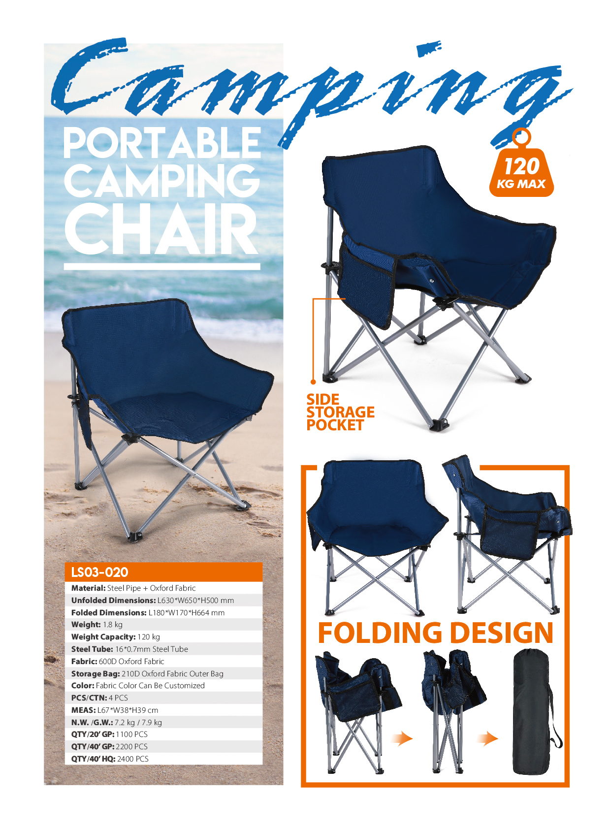 LS03-020This portable chair is perfect for both indoors and outdoors activities. We are aiming to bring you back to nature/outdoor. Enjoy your sport events, picnic, hiking, camping and fishing. It can also use in garden when having barbecue. It is sturdy and extra-light to carry with.