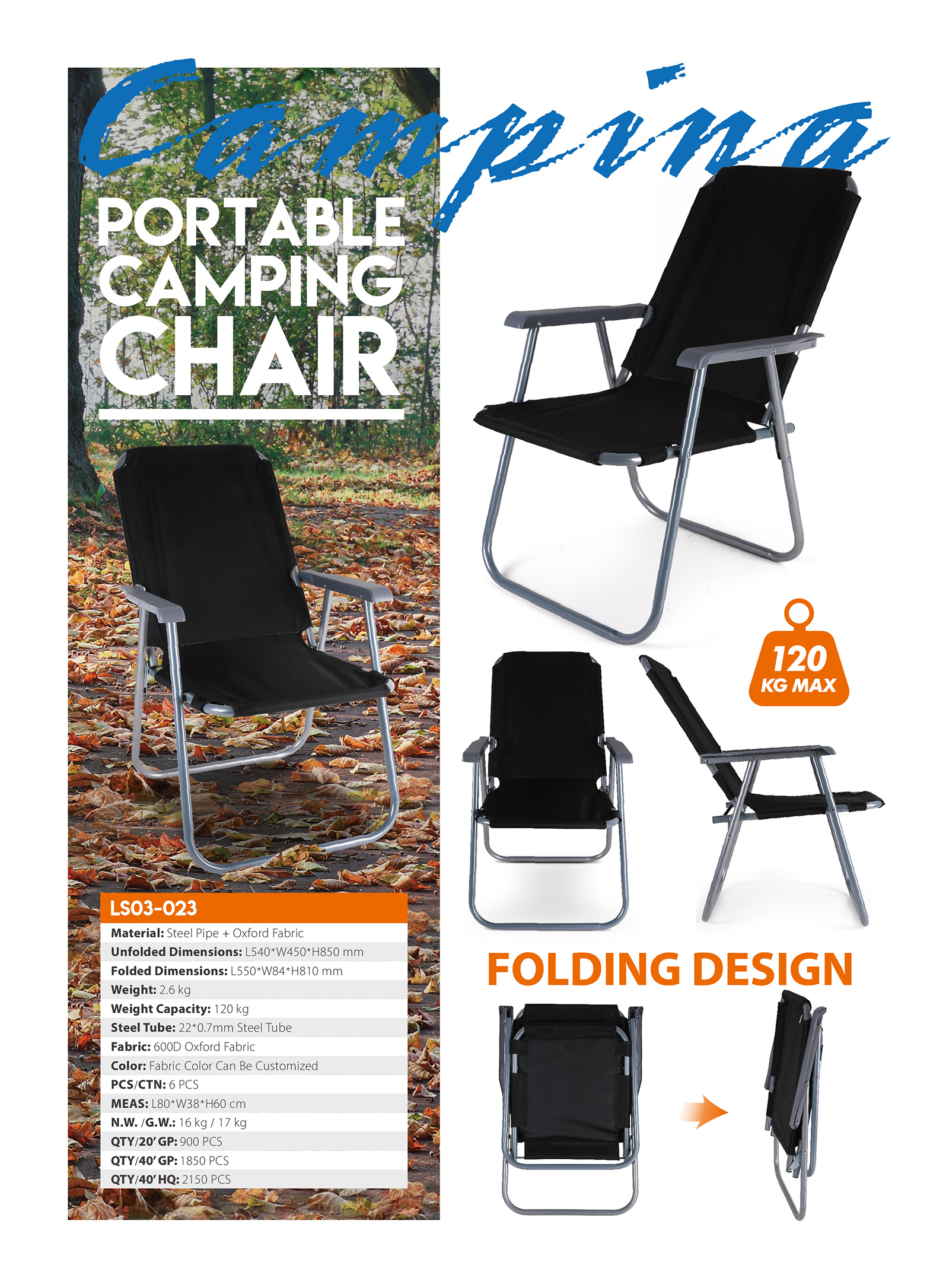 LS03-023This portable chair is perfect for both indoors and outdoors activities. We are aiming to bring you back to nature/outdoor. Enjoy your sport events, picnic, hiking, camping and fishing. It can also use in garden when having barbecue. It is sturdy and extra-light to carry with.