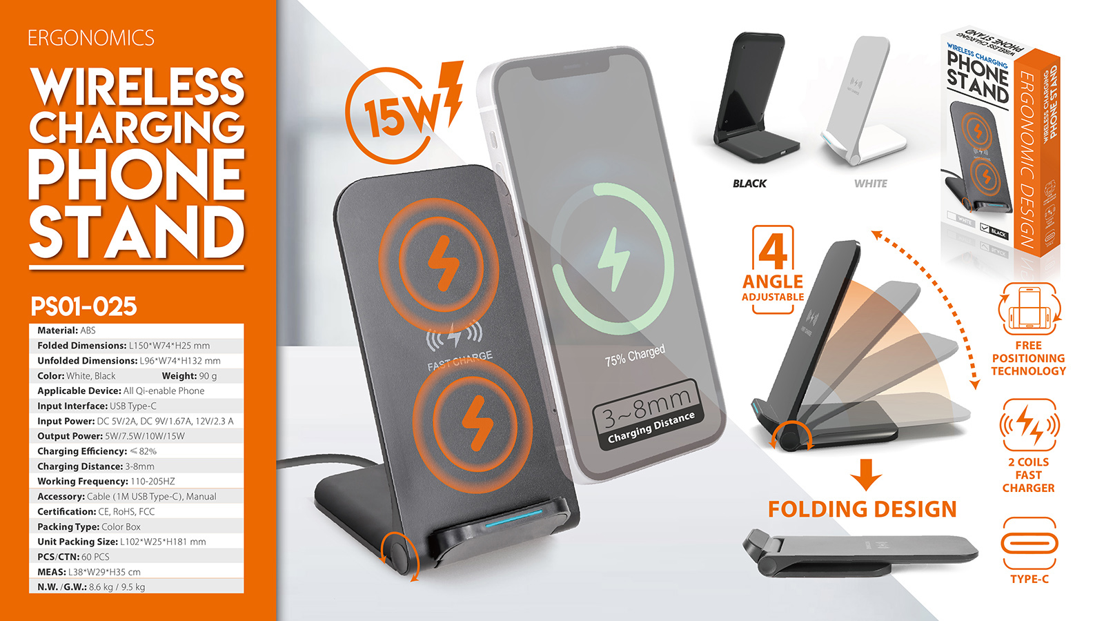 PS01-025Ergonomic stand design, charging your phone vertically or horizontally, enjoys movie and music without interrupting while charging.