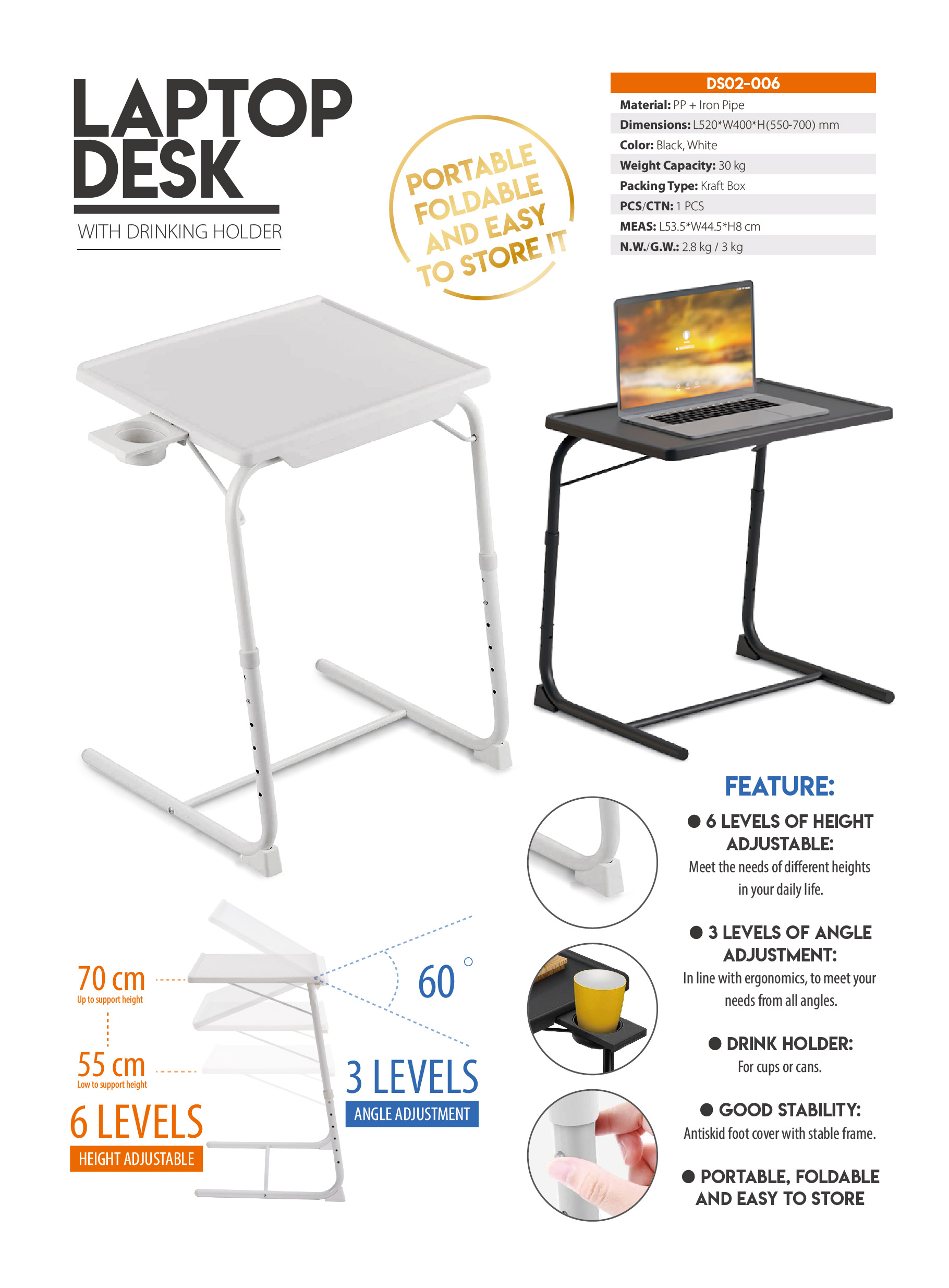 DS02-0066 levels of height adjustable, Meet the needs of different heights in your daily life. 3 levels of Angle adjustment, In line with ergonomics, to meet your needs from all angles. Portable, foldable and easy to store