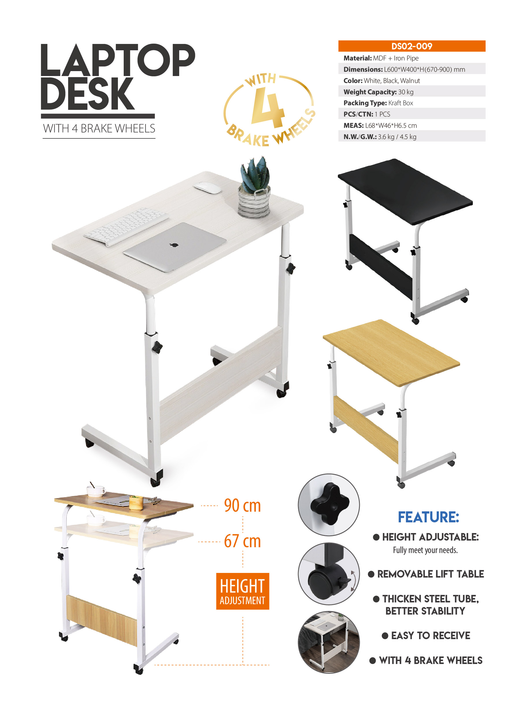 DS02-009Removable lift table and height adjustable, fully meet your needs. Thicken steel tube, better stability. With 4 brake wheels.