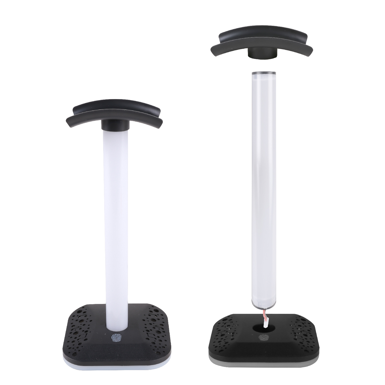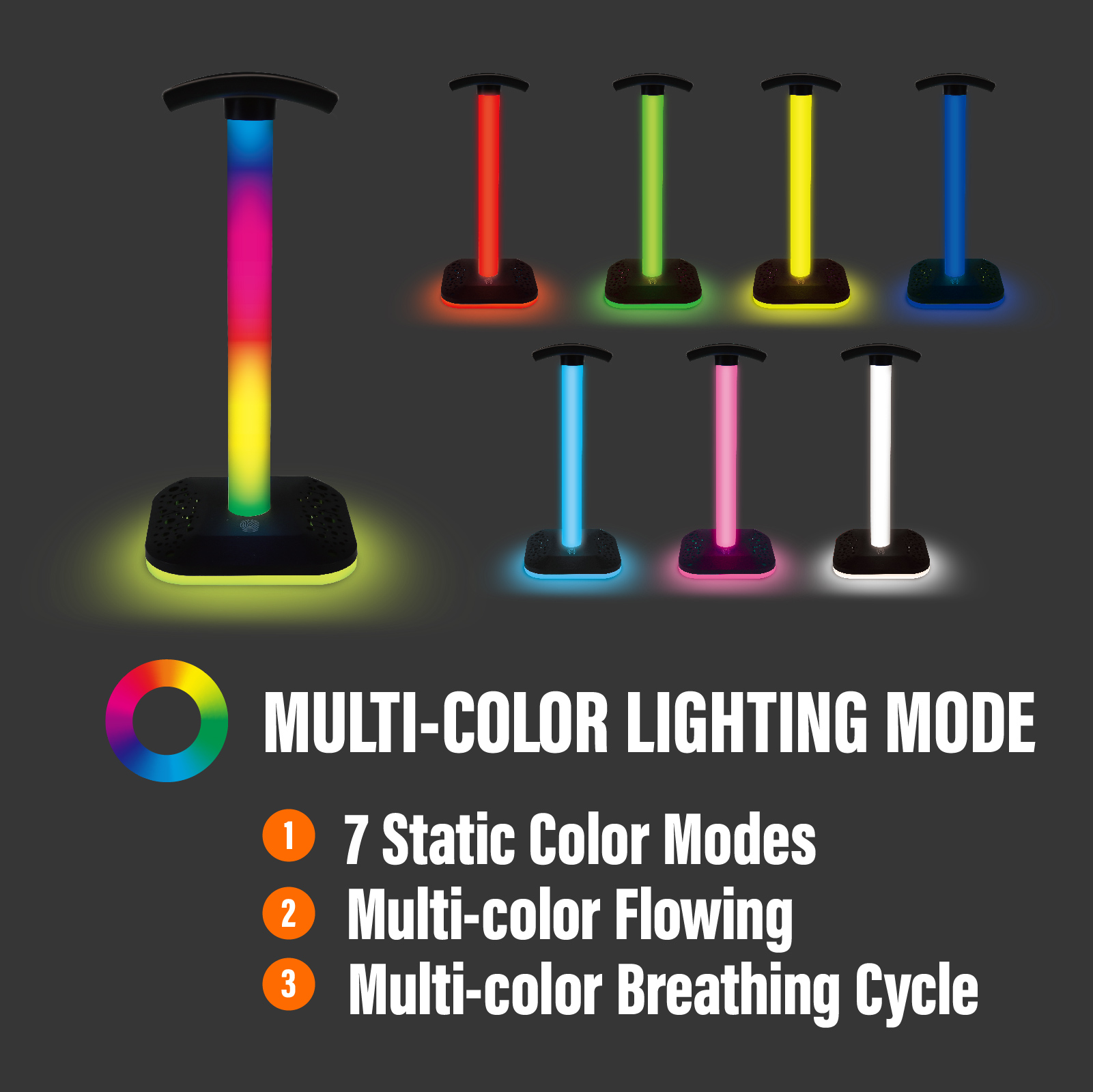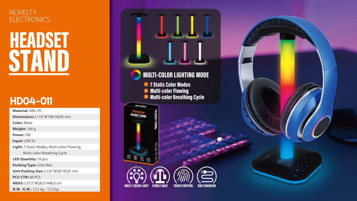 HD04-011The headphone stand has a bright and dazzling lighting effect, creating a cool and enthusiastic gaming atmosphere. Gaming headset stand has 9 light effect modes. Include 1 color cycle modes, 1 breathing mode and 7 static modes. The light is evenly distributed, and the color of the base and lamp will shift together as the light effect is switched.