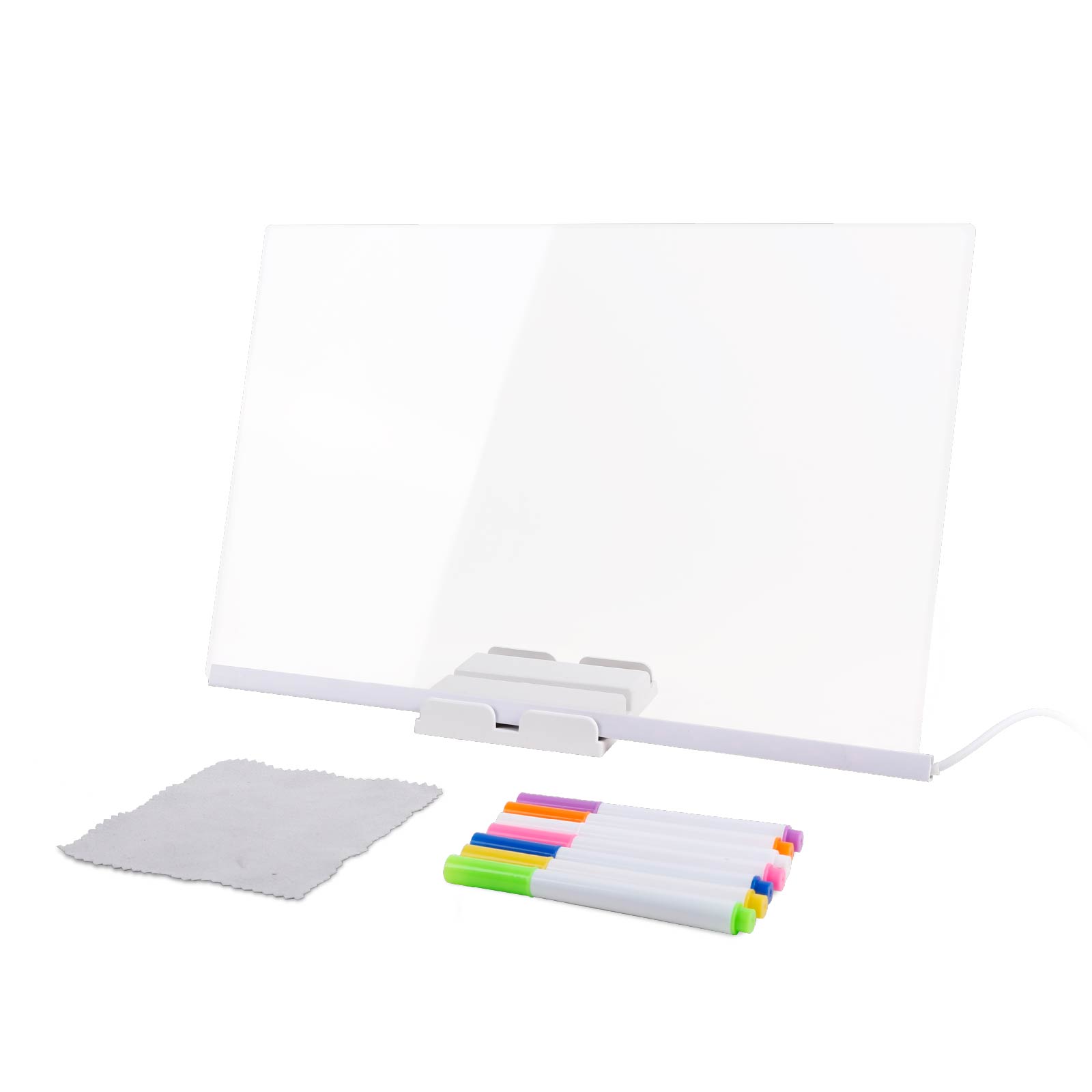 DB01-005Clear acrylic dry erase board with light, classic, fashionable and clear appearance design, perfect for the office, home, or any other environment, glow memo the fashion design adds a unique charm to your desktop. As a note glass led board, write down your message.