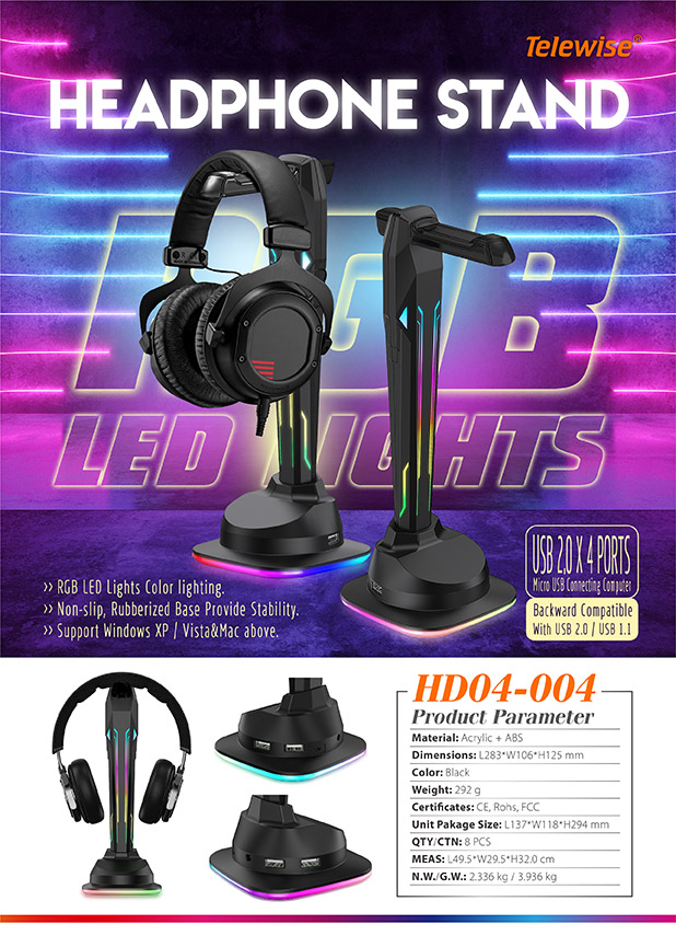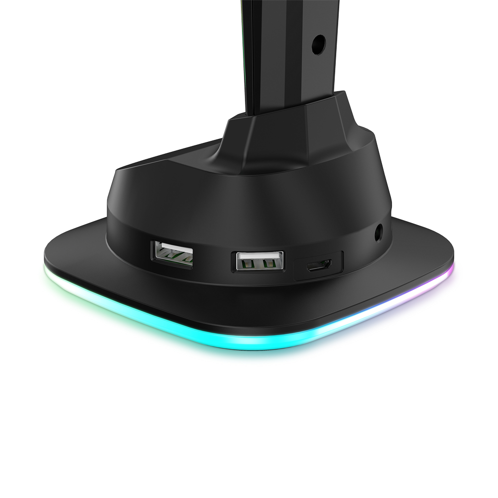 HD04-004This headset stand freeing up the clutter on the desktop, making it a cool gaming gadget. RGB lighting effects available, creating vivid gaming ambience.