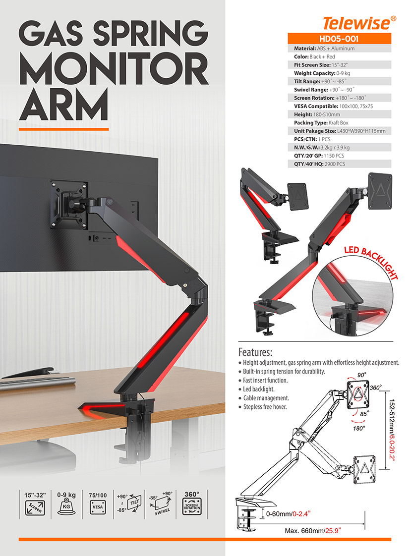 HD05-001Fast insert function, led backlight, cable management, built-in spring tension for durability, height adjustment, gas spring arm with effortless height adjustment, stepless free hover.