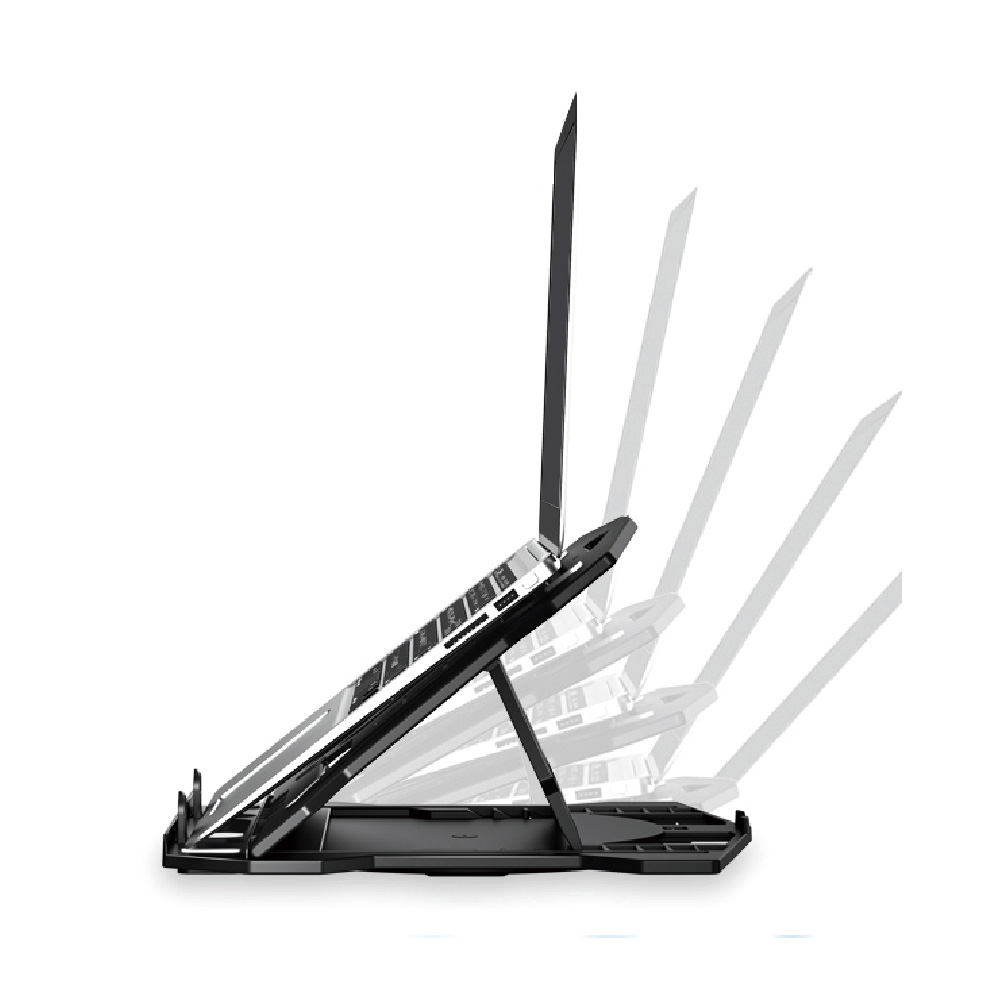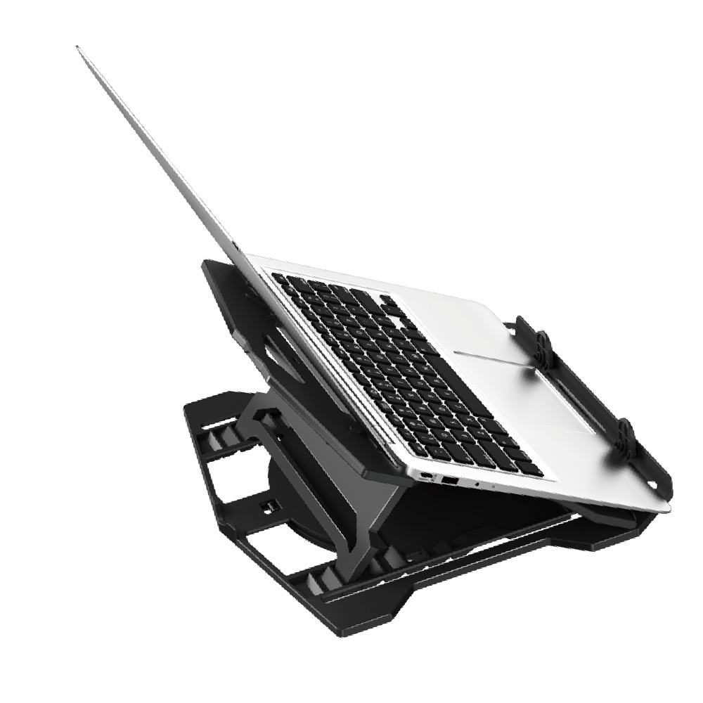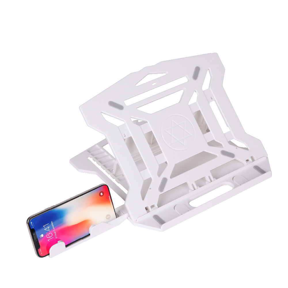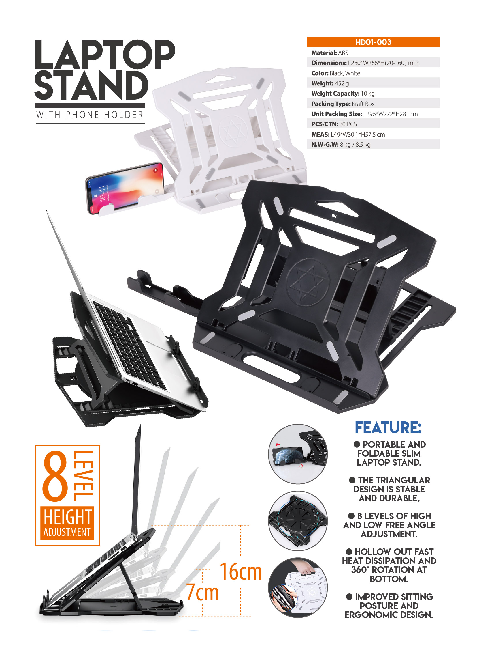 HD01-003Portable and foldable slim laptop stand. The triangular design is stable and durable, 8 levels of high and low free angle adjustment, hollow out fast heat dissipation and 360°rotation at bottom, improved sitting posture and ergonomic design.