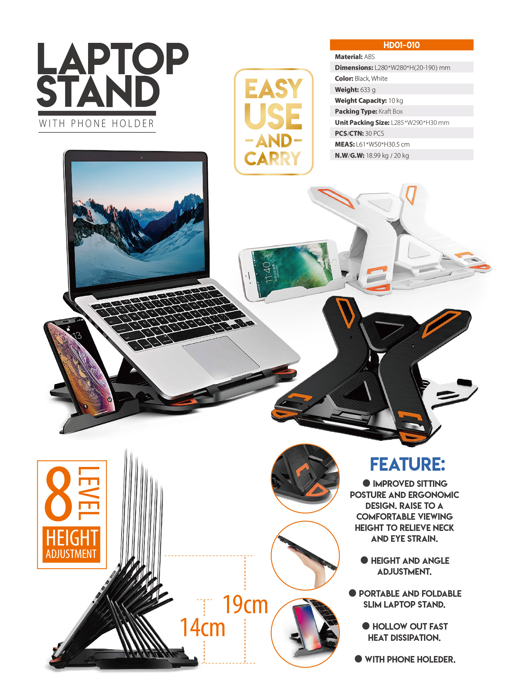 HD01-010Improved sitting posture and ergonomic design. Raise to a comfortable viewing height to relieve neck and eye strain. Height and Angle adjustment. Portable and foldable slim laptop stand. Hollow out fast heat dissipation. With phone holeder.
