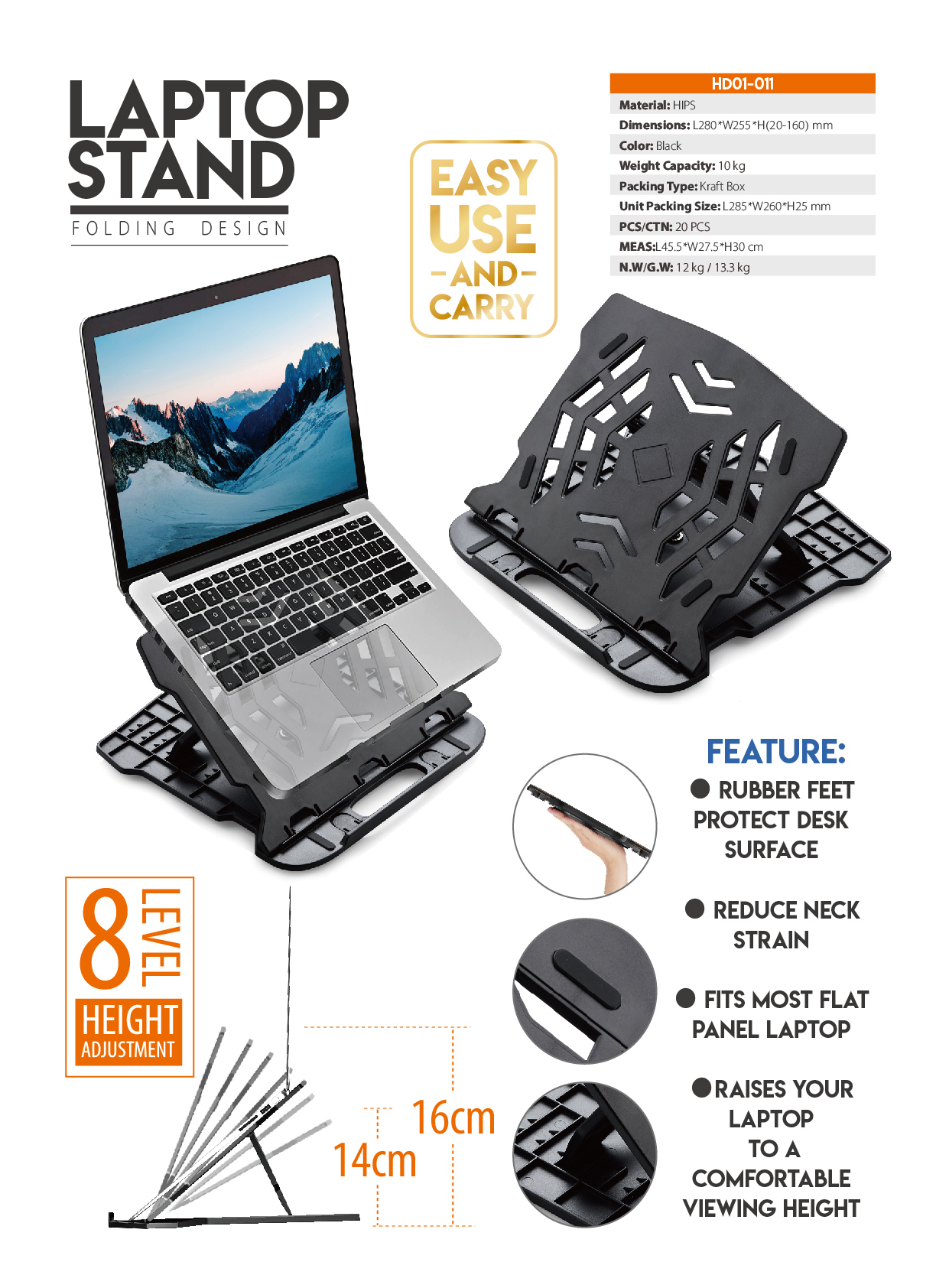 HD01-011Rubber feet protect desk surface. Reduce Neck Strain. Fits Most Flat Panel Laptop. Raises Your Laptop to A Comfortable Viewing Height.