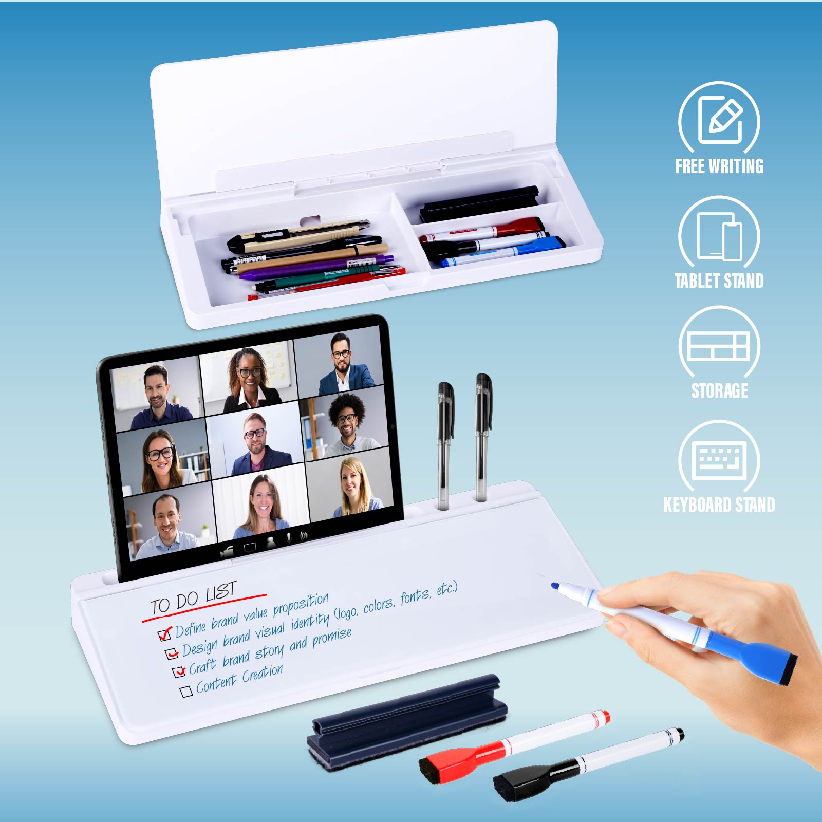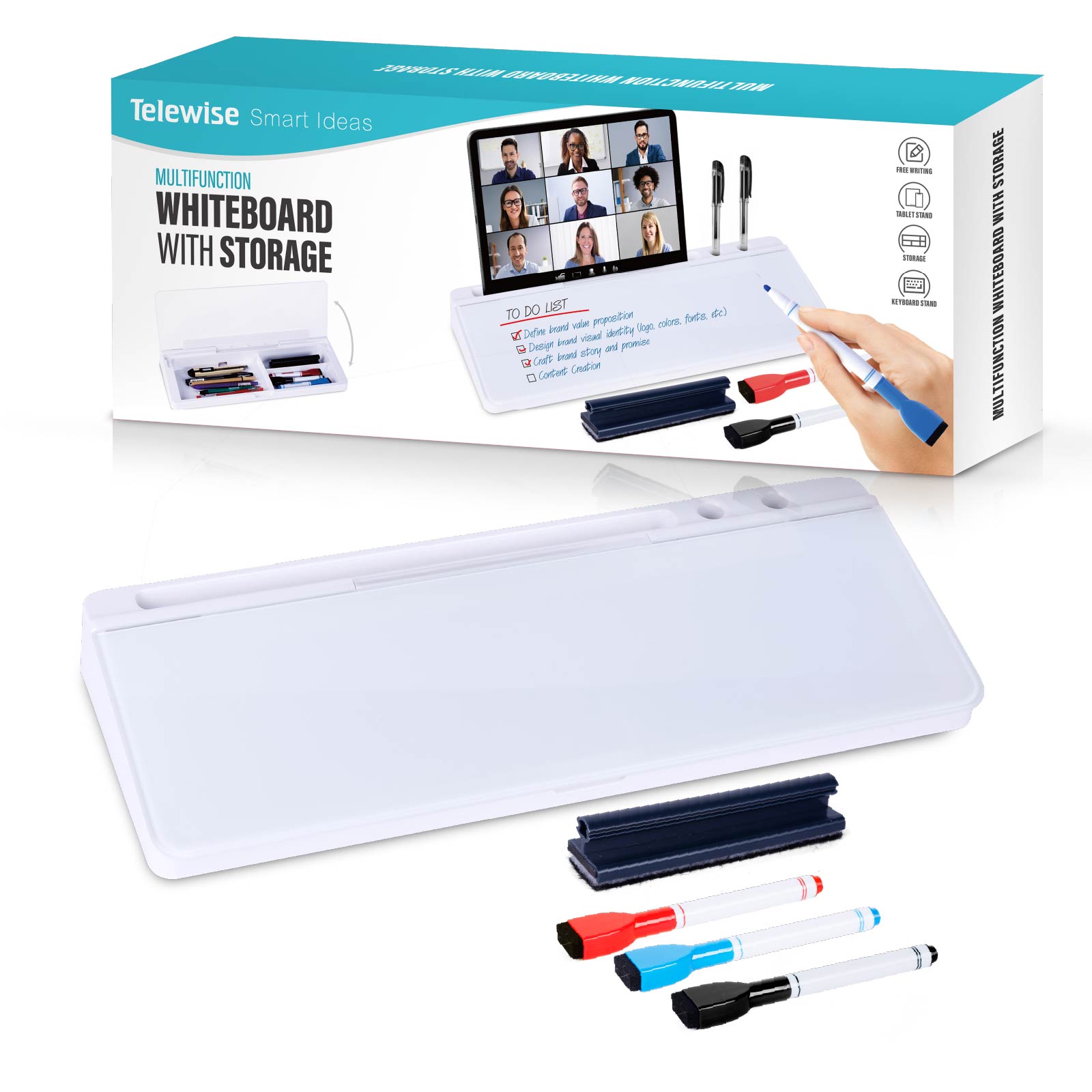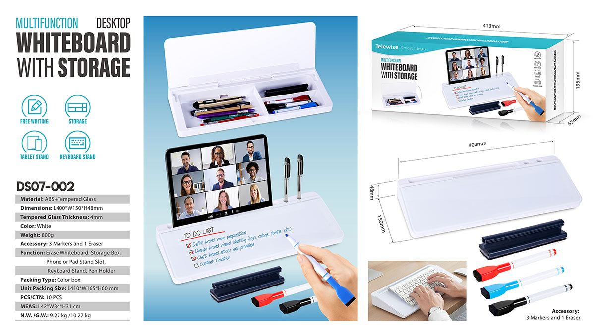 - Function : Erase Whiteboard, Storage Box, Phone or Pad Stand Slot, Keyboard Stand, Pen Holder,
