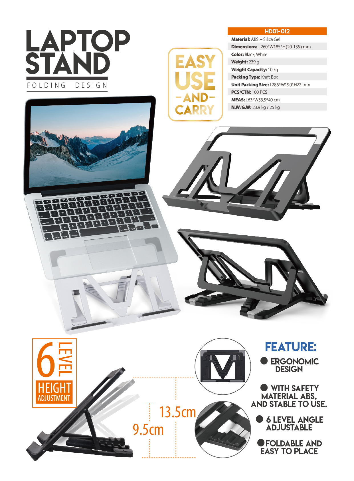 HD01-012Ergonomic design, with safety material abs, and stable to use. 6 level angle adjustable. Foldable and easy to place.