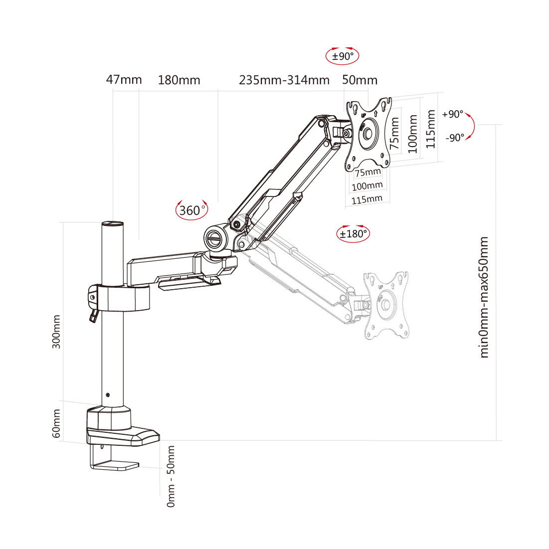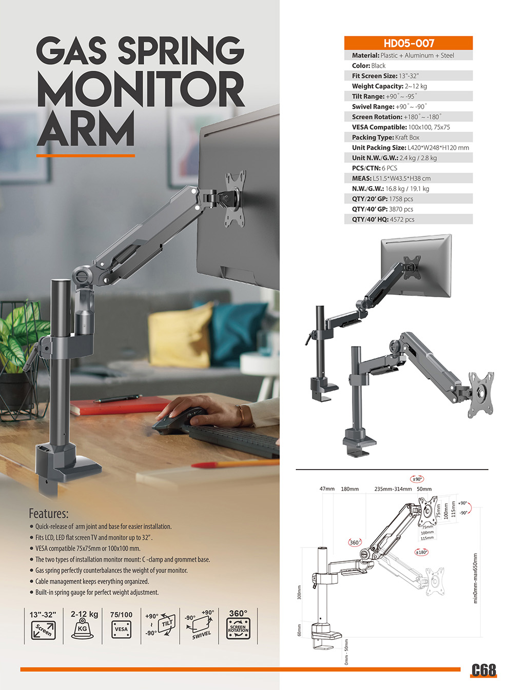 HD05-007Quick-release of arm joint and base for easier installation. Fits LCD, LED flat screen TV and monitor up to 32〃 . VESA compatible 75x75mm or 100x100 mm. The two types of installation monitor mount: C -clamp and grommet base. Gas spring perfectly counterbalances the weight of your monitor. Cable management keeps everything organized. Built-in spring gauge for perfect weight adjustment.