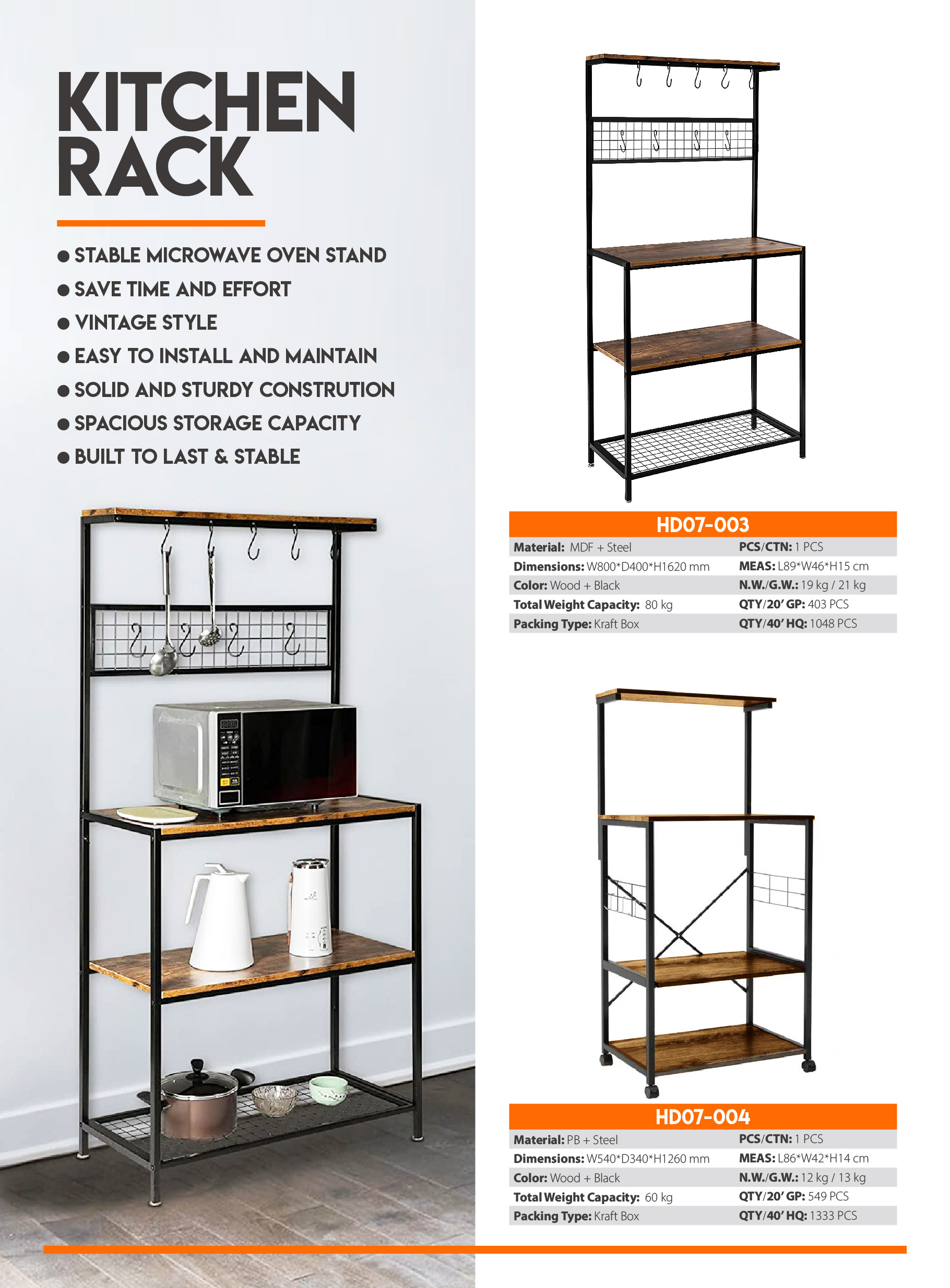 HD07-004Stable microwave oven stand, save time and effort. vintage style, easy to install and maintain, solid and sturdy constrution, spacious storage capacity, built to last & stable.
