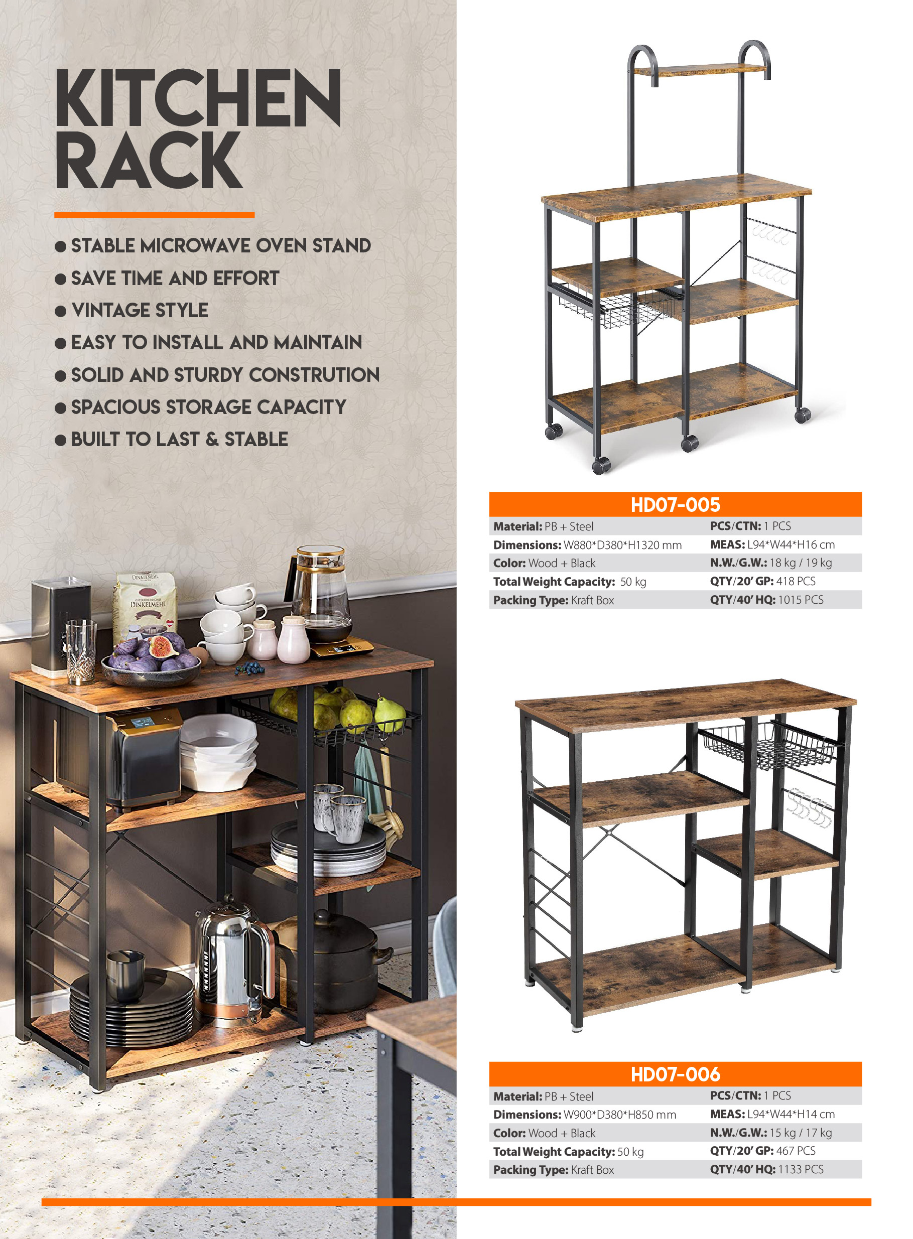 HD07-005Stable microwave oven stand, save time and effort. vintage style, easy to install and maintain, solid and sturdy constrution, spacious storage capacity, built to last & stable.