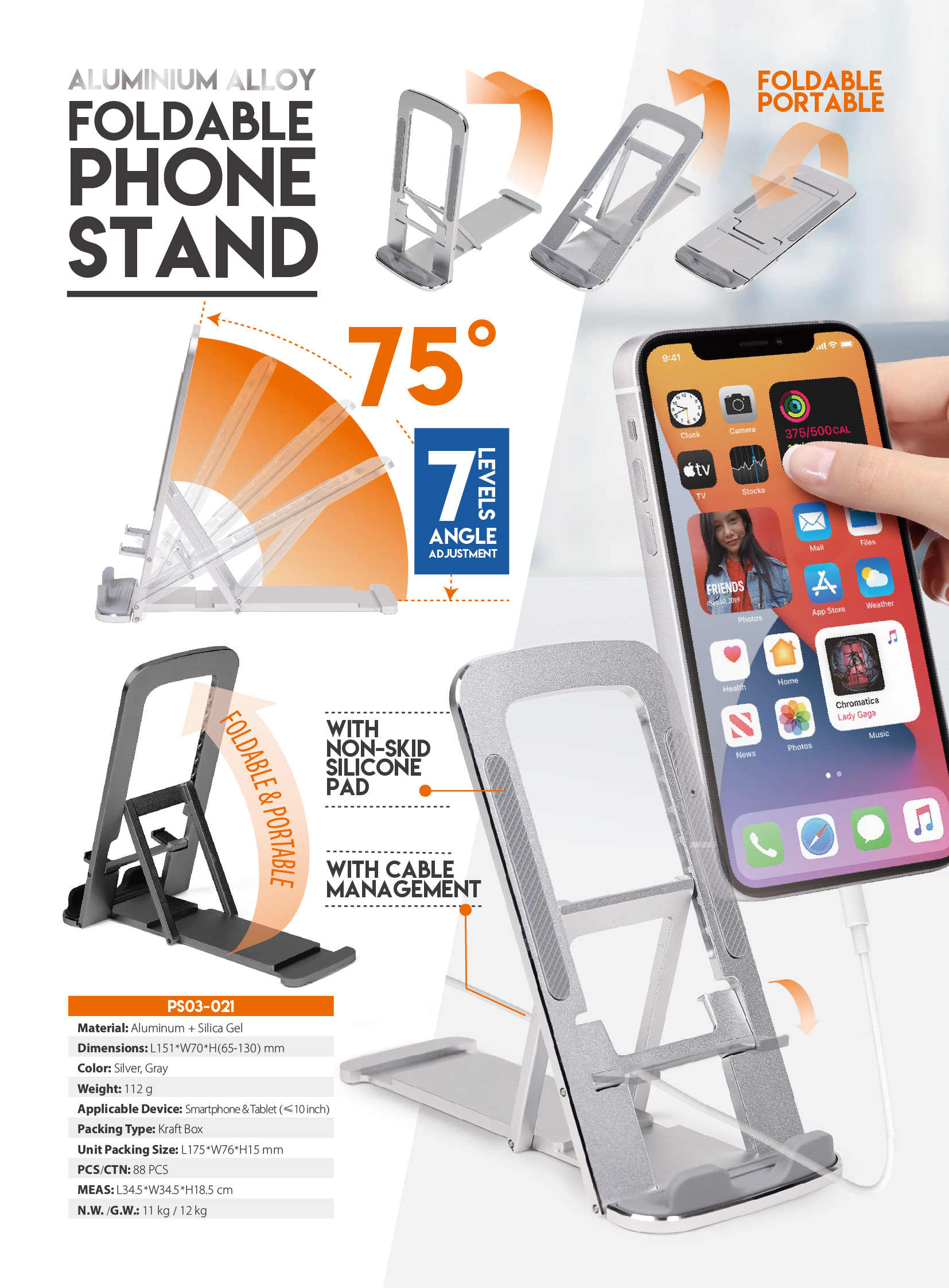 PS03-021Height adjustable, foldable design, portable. With non-skid silicone pad, with cable management.