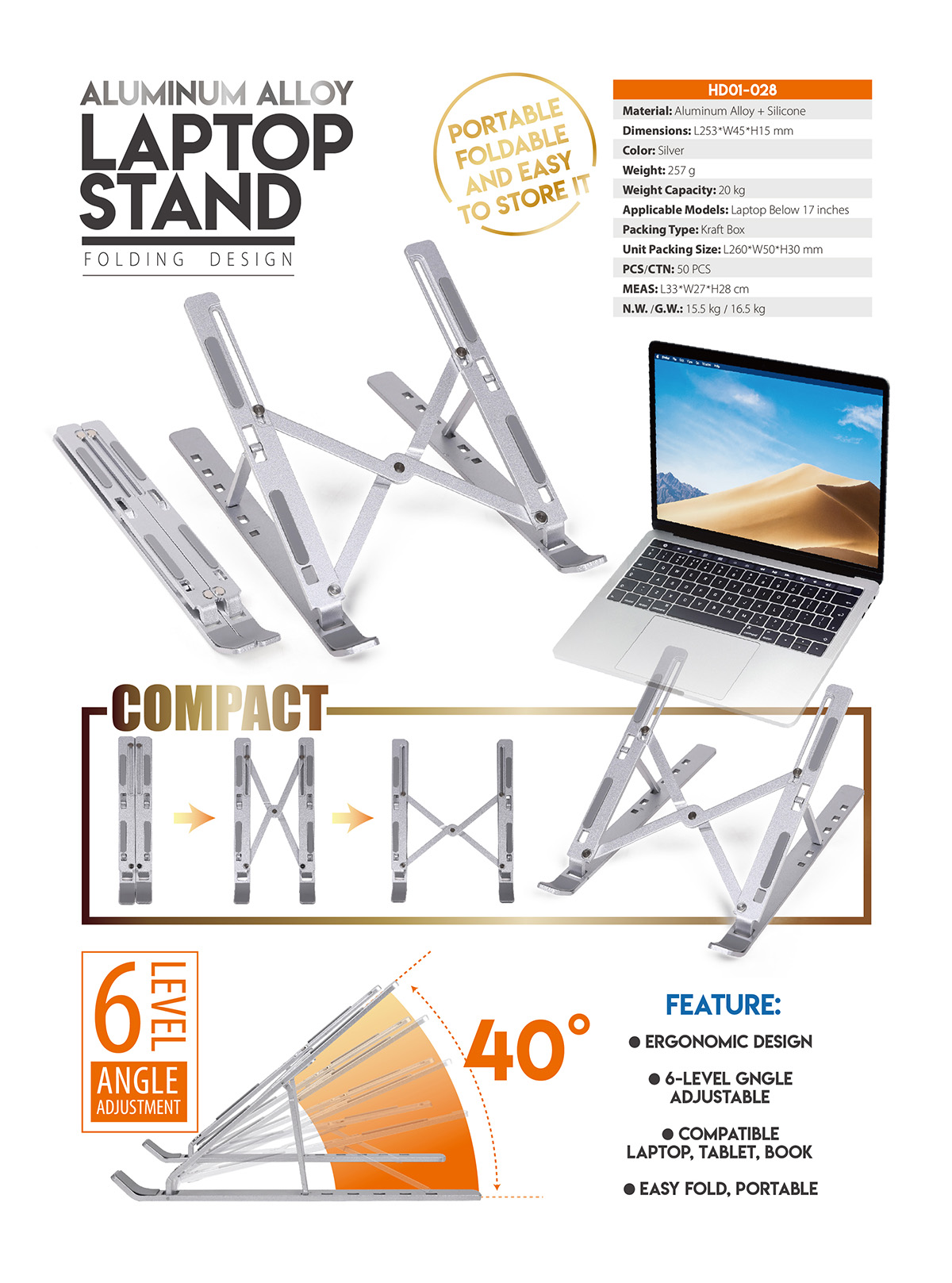 HD01-028Ergonomic design, foldable &portable, 6 level angle adjustable, good heat dissipate design.