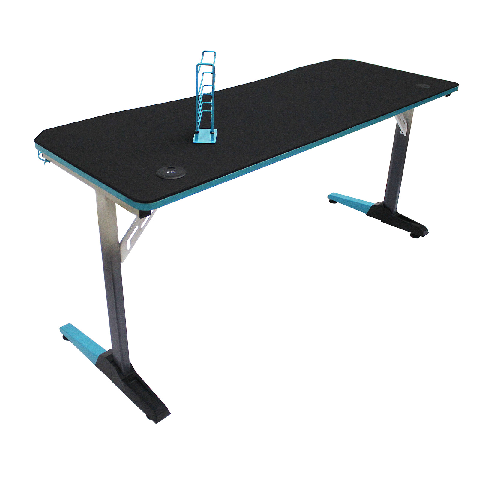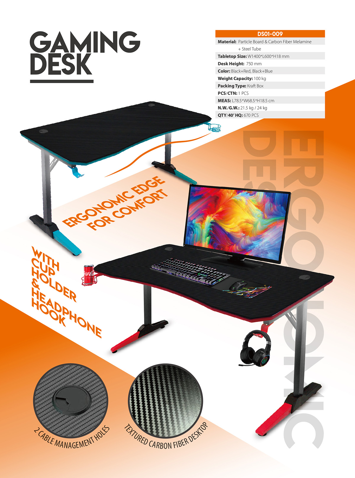 DS01-009With cup holder & headphone hook, leveling feet, ergonomic edge for comfort, textured desk surface.