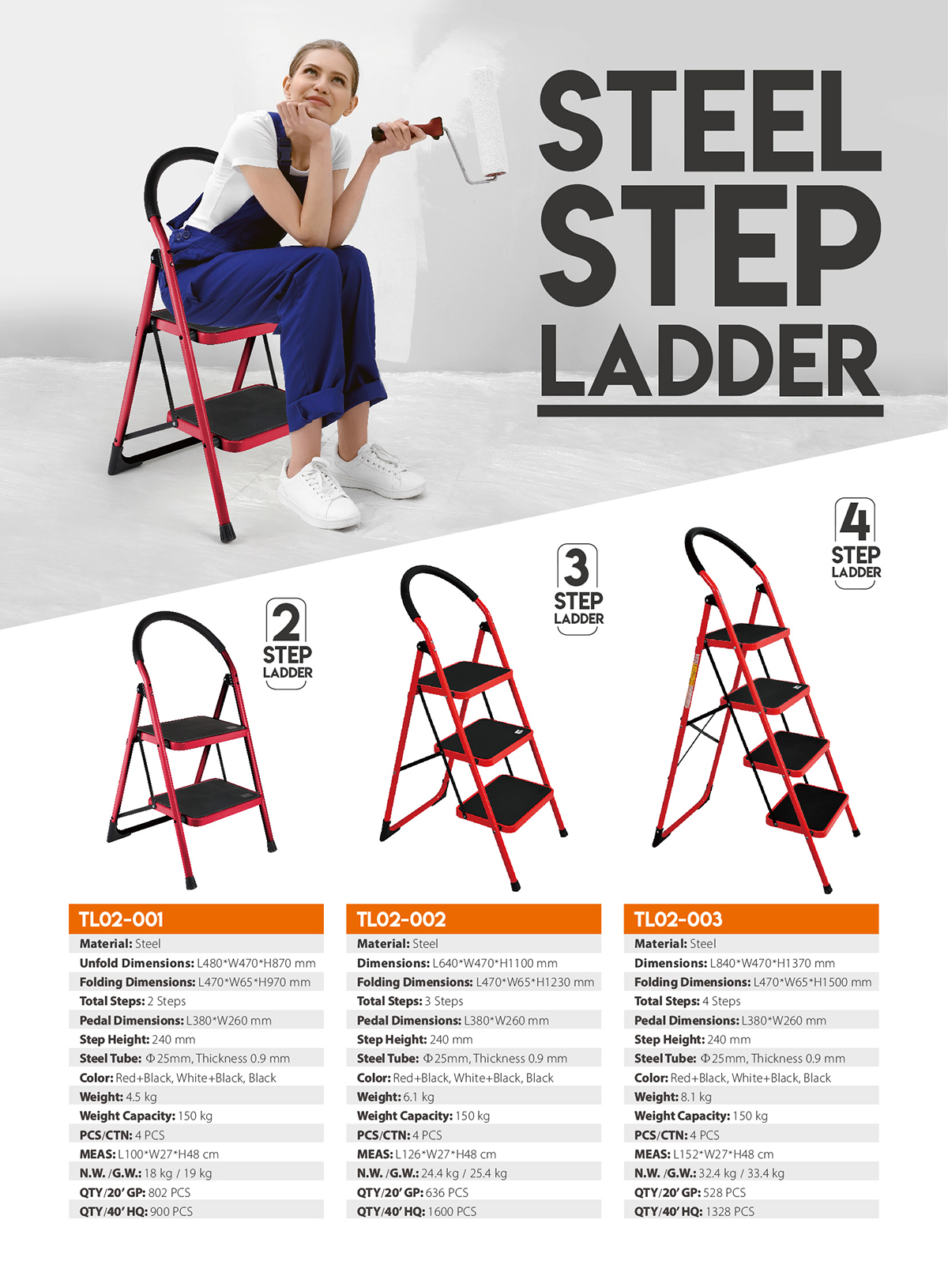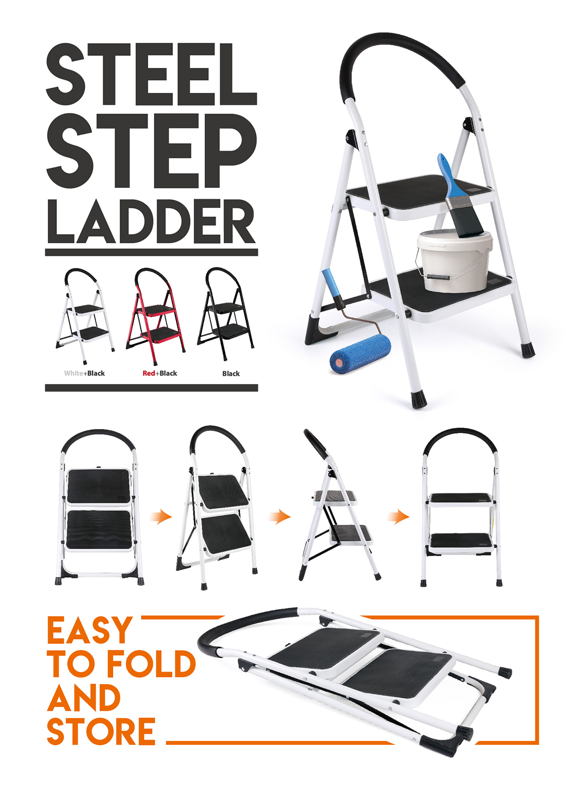 Ladder’s steps and tube are made of high quality steel/light and easy to move. Small size after folding can be stored conveniently. Handrail with cotton let the use more comfortable. Big wider step with non-slip mat effect/big buffer catch the floor very well.