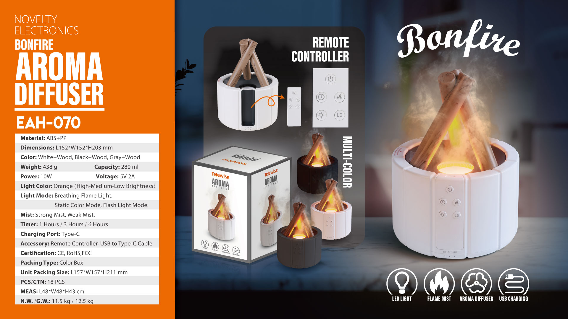 The combination of flame noctilucent and fog produces a realistic effect, just like the flames burning in the fireplace, bringing a romantic healing atmosphere at night, the atmosphere of the room will be very romantic and healing.