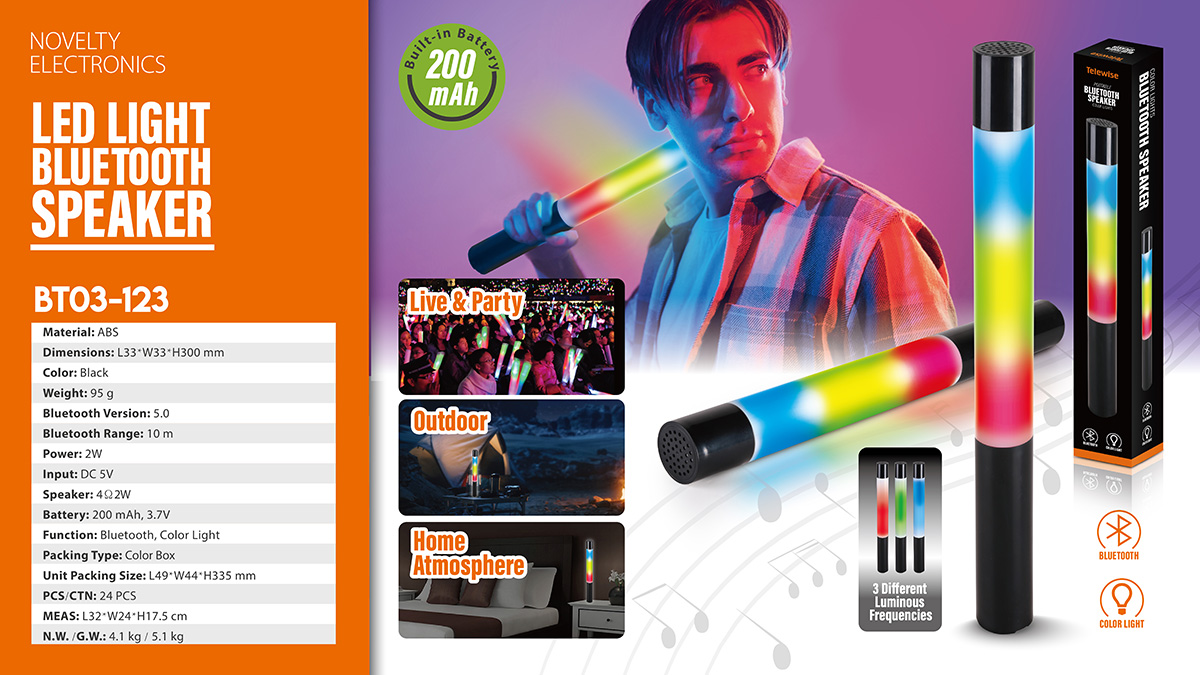 Portable Handheld Light Wand & Bluetooth Speaker. The perfect sound quality makes the Bluetooth speaker ideal for outdoors and indoors to enjoy your music. The portable and compact design also makes the speaker used as a unique led night light, which creates a romantic atmosphere to light up your space.