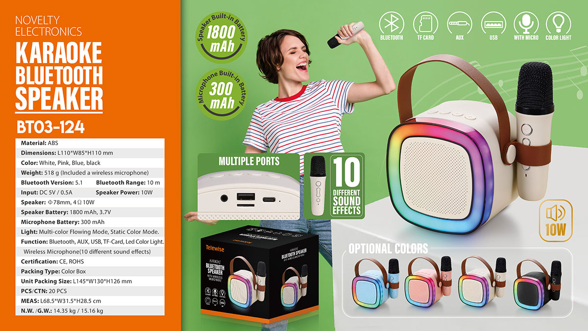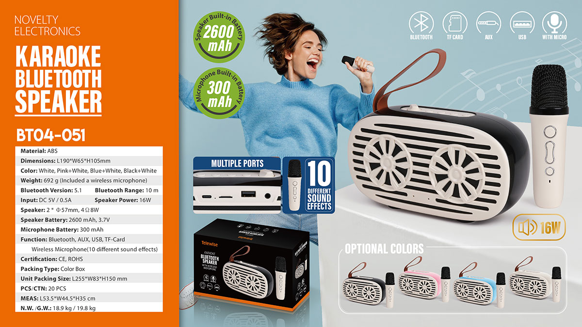 Mini karaoke bluetooth speaker set includes portable speaker & small and exquisite microphones ( 10 different sound effects). Lightweight karaoke machine with internal rechargeable battery,With a leather wristband, this retro speaker is sturdy and portable to take anywhere,Perfect for family outing, karaoke party, house party, church, hotel conference room, classroom, lecture room, gymnasium, fitness center, workspace, playroom and any party venue.
