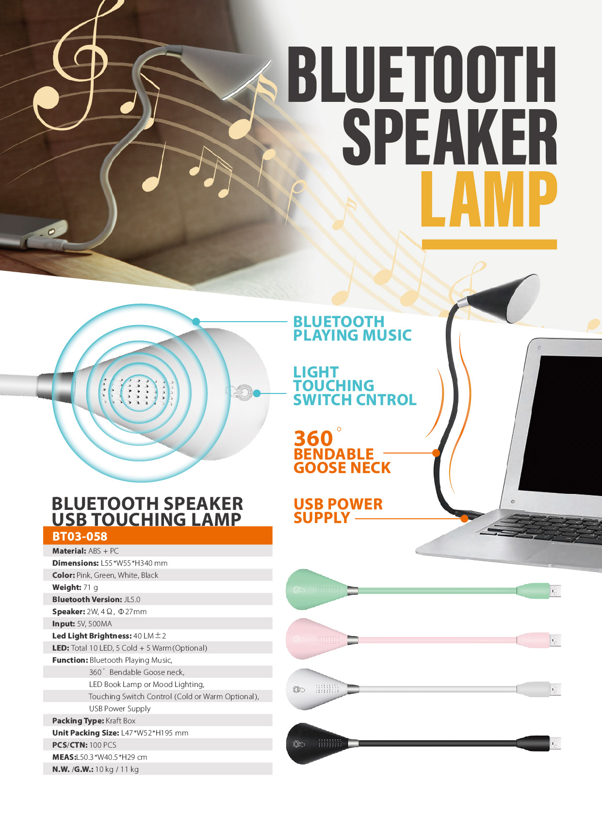 Function: Bluetooth Playing Music, 360° Bendable Goose neck, LED Book Lamp or Mood Lighting, Touching Switch Control (Cold or Warm Optional)