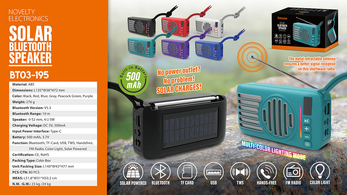 No power outlet? No problem! SOLAR CHARGES! The metal retractable antenna ensures a better signal reception on this shortwave radio. The perfect sound quality makes the Bluetooth speaker ideal for outdoors and indoors to enjoy your music. The portable and compact design also makes the speaker used as a unique led night light, which creates a romantic atmosphere to light up your space.