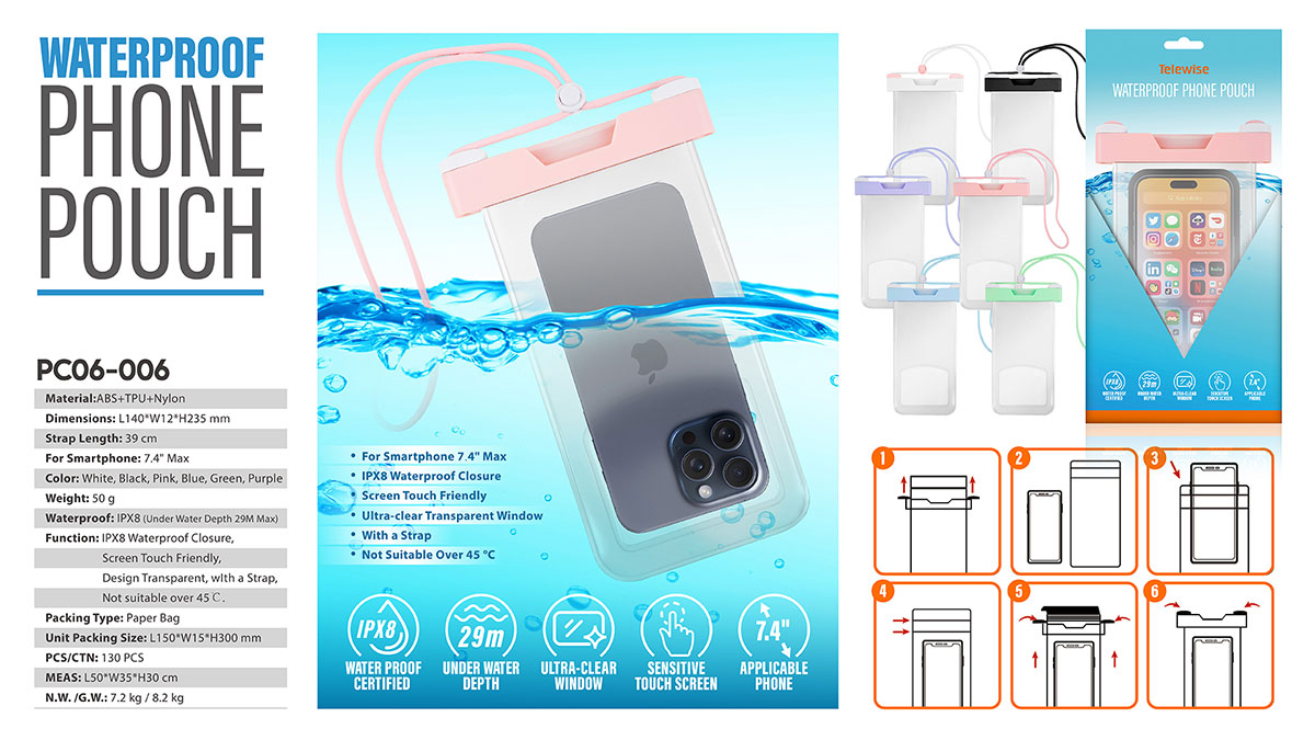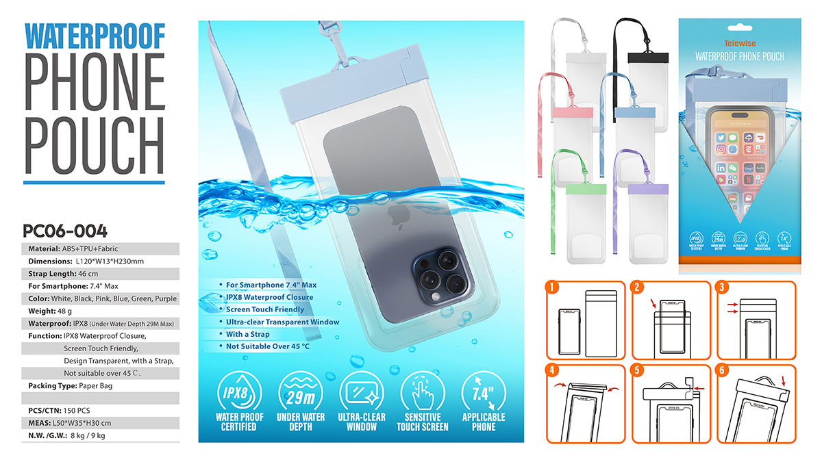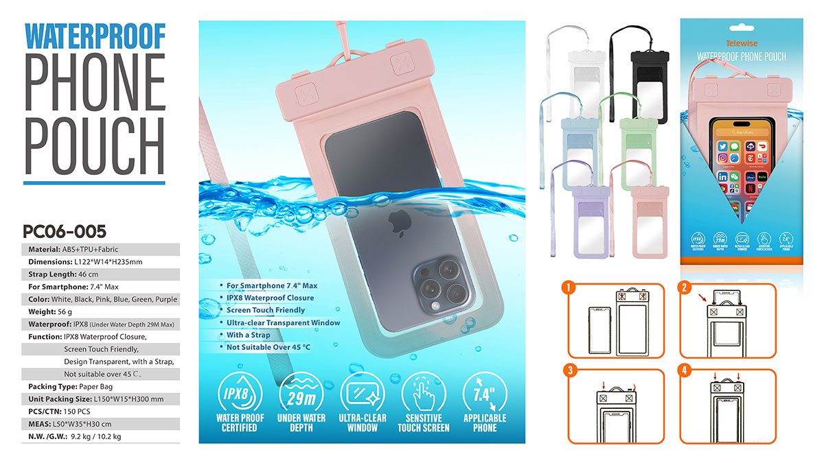 Function: IPX8 Waterproof Closure, Screen Touch Friendly, Design Transparent, wIth a Strap, Not suitable over 45℃.