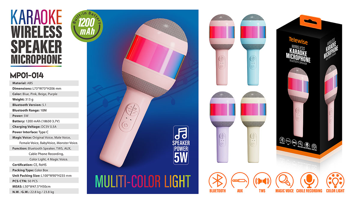 Function: Bluetooth Speaker,TWS, AUX, Cable Phone Recording, Color Light, 4 Magic Voice.
