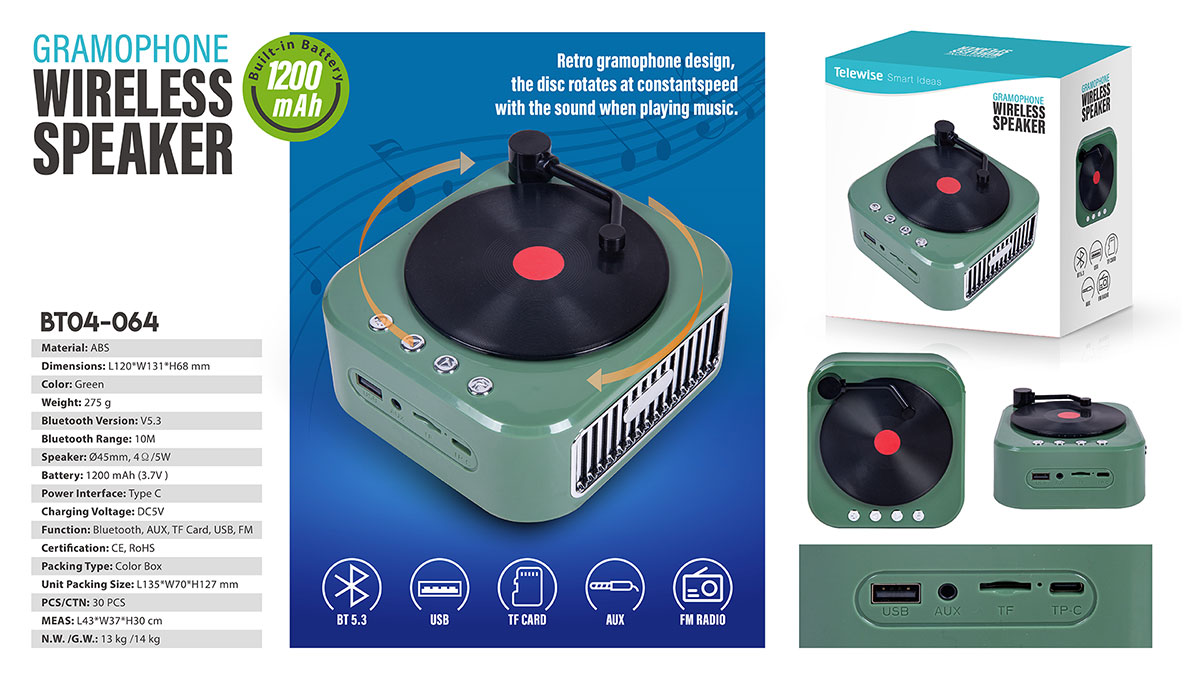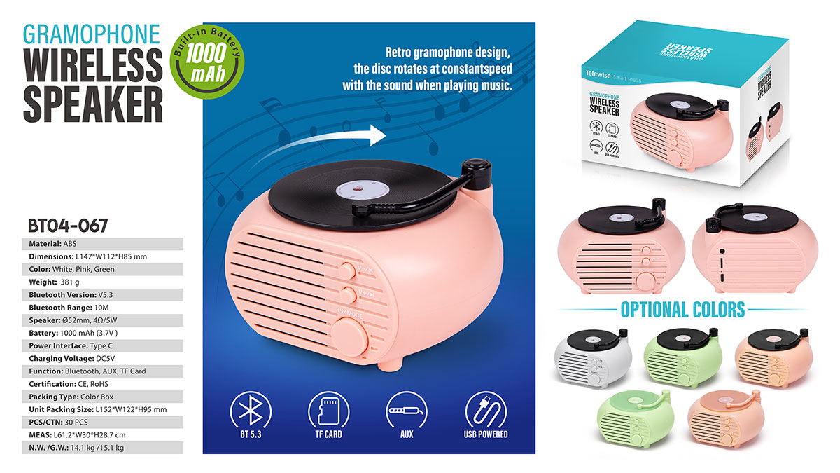 The fakes vinyl actually spins when playing! This old fashioned classic style bluetooth speaker takes you back to the old time, small size with surprisingly sound. A nice decoration, cute gift for girls.